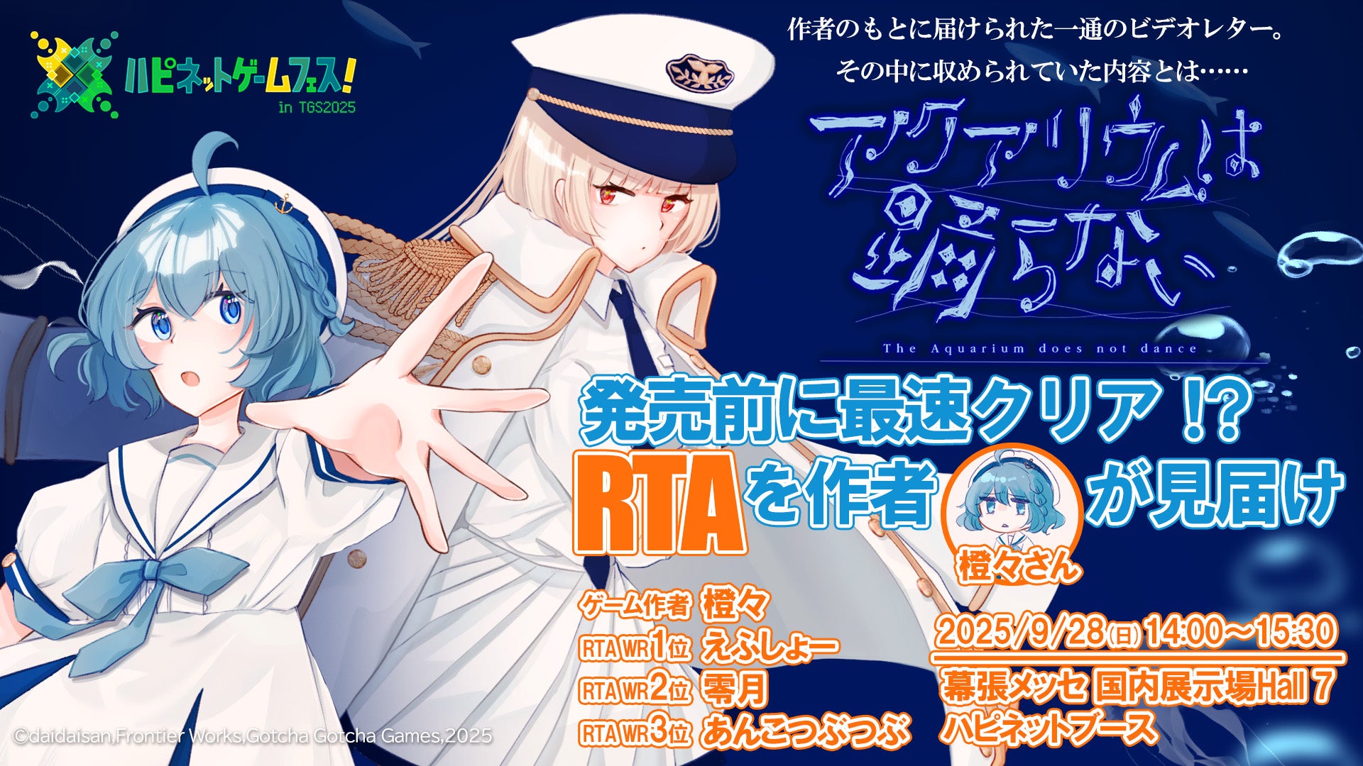 2025年10月30日パッケージ版発売予定「アクアリウムは踊らない」作者の橙々氏が登壇し、実況プレイを見ながら生トークをいたします。ゲストには本作リアルタイムアタック世界記録保持走者の皆さんを招き、撮り下ろしのビデオレターを持参いただきます。昨年末トレンドワードにもなった「公開デバッグ」が再び!? 作者も知らない裏技が見られるかも……ぜひ会場でご確認ください。