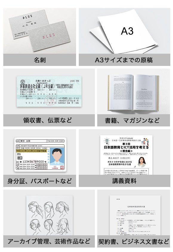 「NETUM Pro」は、様々な用紙サイズに柔軟に対応。小さな名刺や領収書からA3サイズの原稿まで、幅広いサイズの書類を手軽にデジタル化できます。
