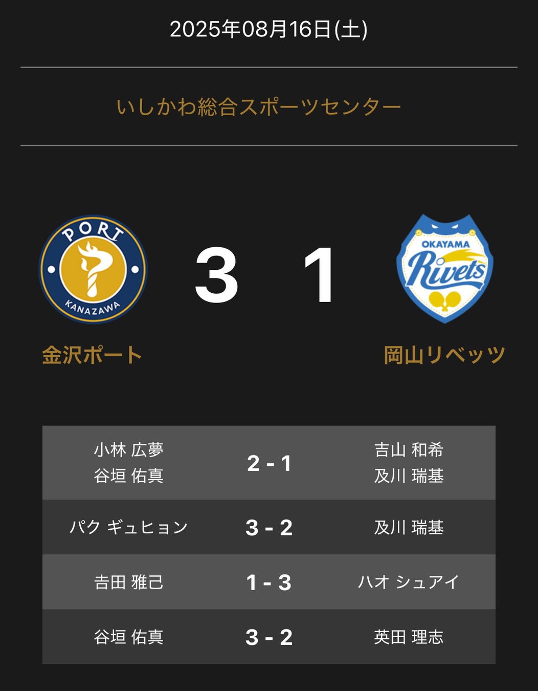 ノジマTリーグ 2025-2026シーズン 公式戦 8月16日開催 金沢ポート vs 岡山リベッツの試合は、3-1で金沢ポートが勝利しました。