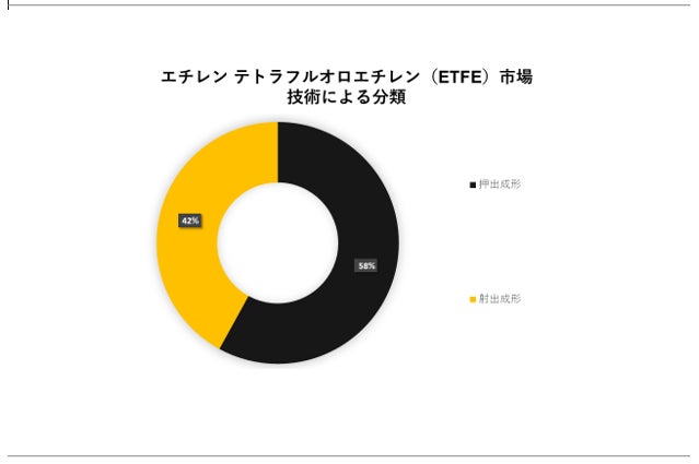 技術に基づいて、射出成形は、強度があり、三次元製品の製造に適していることから、ETFE市場の技術カテゴリーをリードすると予想される分野で あります。押出成形は2次元の製品製造に使用され、押出された製品は比較的弱いです。射出成形は、電子機器ハウジング、機械部品、ボトルキャップ、容器、コンピューター、テレビ部品、屋外家具、農産物、玩具などの固体部品を製造しており、市場シェアの65%を占めています。