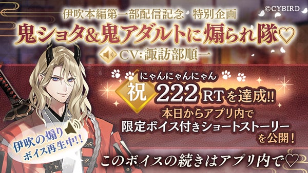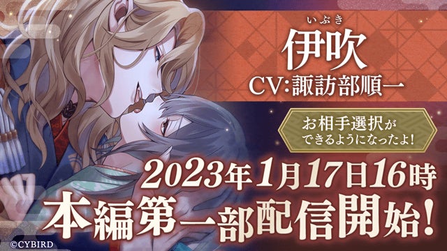 株式会社サイバード(本社:東京都渋谷区、代表取締役社長 兼 CEO 本島 匡、以下「サイバード」)が手掛ける、全世界でのシリーズ累計会員数3,500万人を誇る女性向け恋愛ゲーム「イケメンシリーズ」の人気タイトル『イケメン源氏伝 あやかし恋えにし』は、本日2023年1月17日(火)16時より、「伊吹(CV:諏訪部 順一)」の本編第一部を配信開始します。