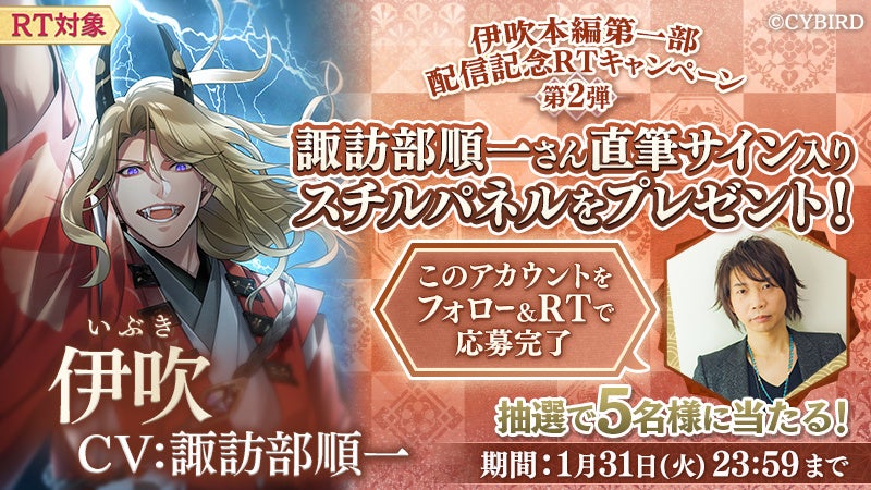 また、配信を記念して限定ボイス付きショートストーリーの公開や、「伊吹」の声優を務めている、諏訪部 順一さんの直筆サイン入りスチルパネルのプレゼント等、豪華キャンペーンを開催しています。