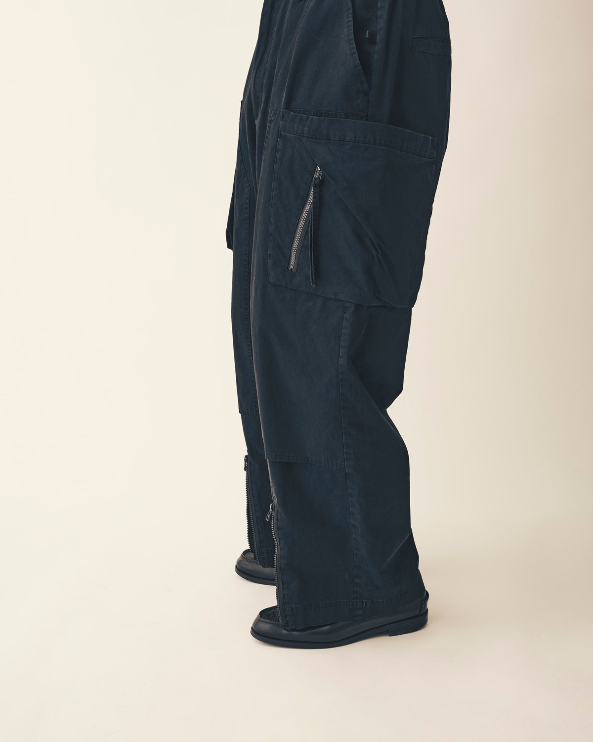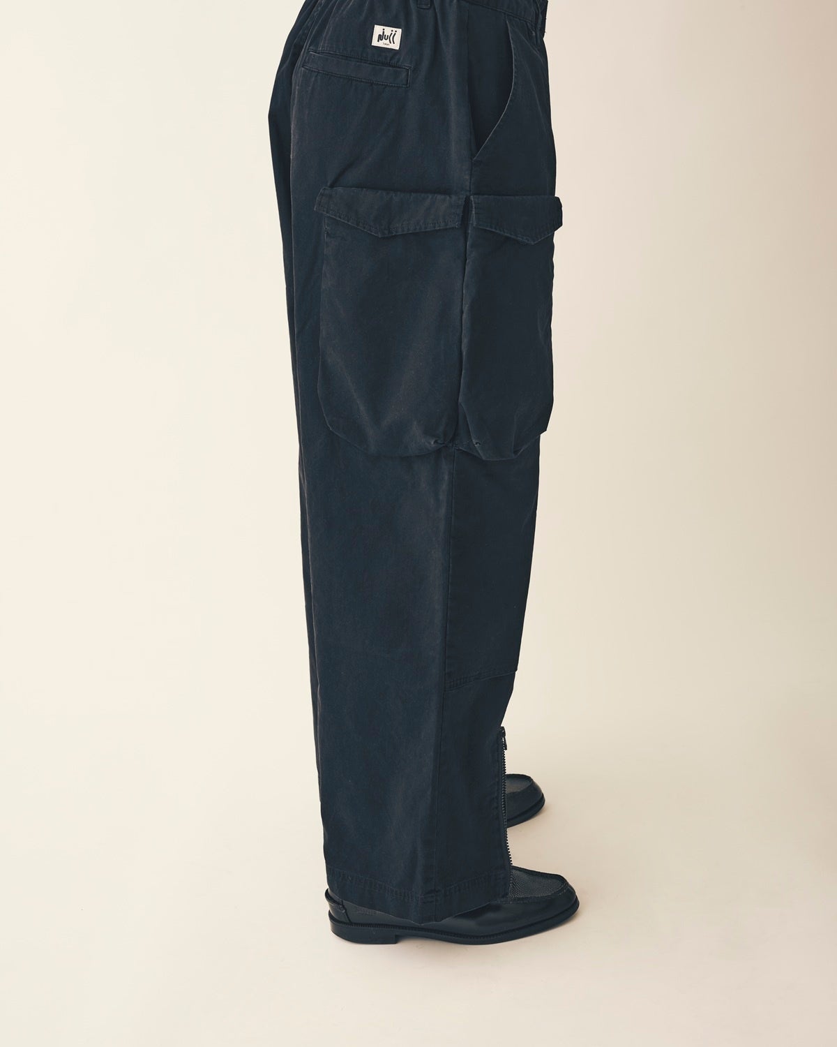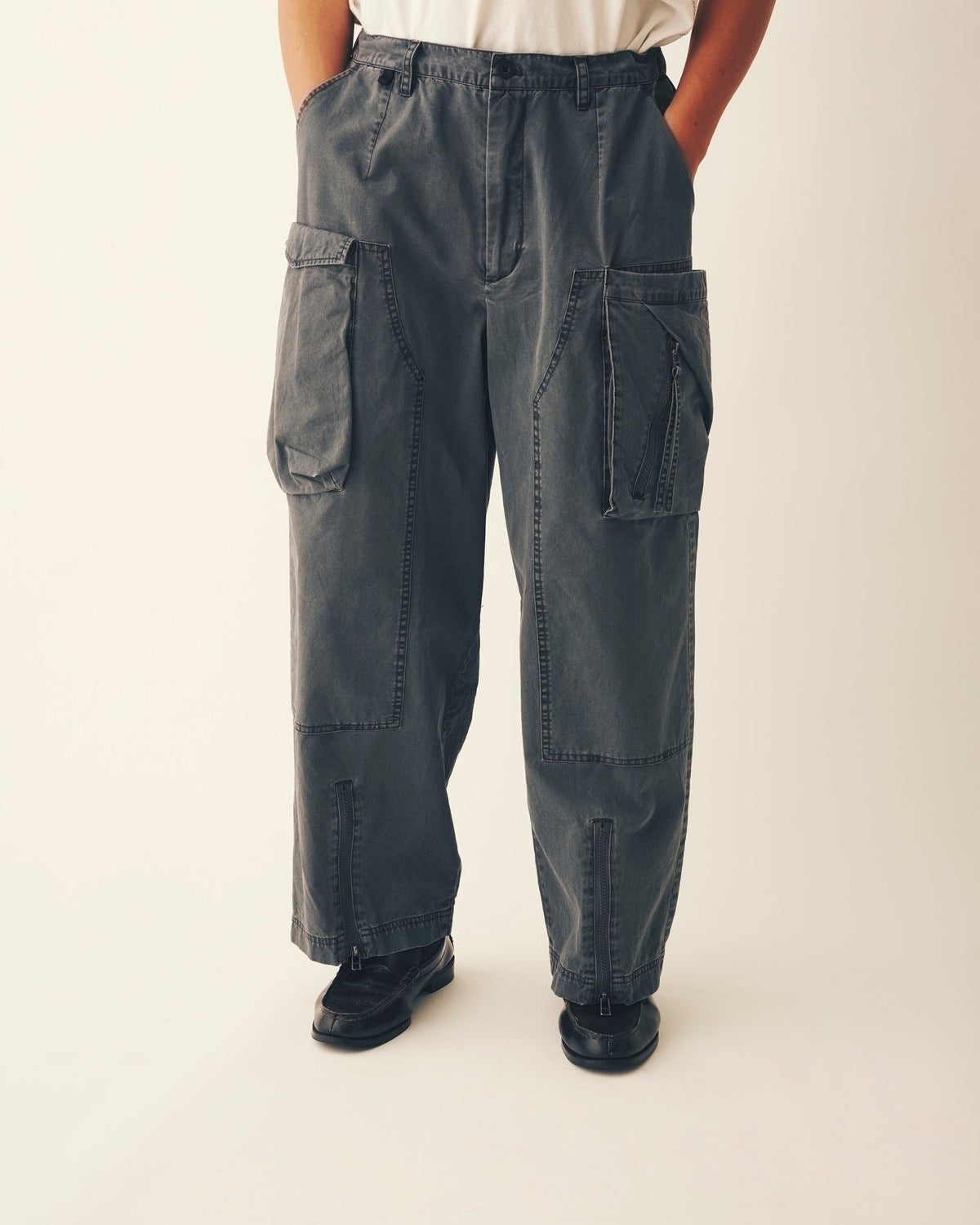 フロントからバックにかけて配された大容量のアシンメトリーポケットが象徴的な、ブランドを代表する「アウトサイドロングパンツ」をベースに、JSR独自のアレンジを落とし込んだ一着です。