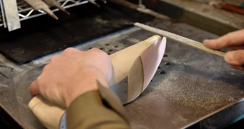 女性の足を一途に研究し、全ての木型を自社工場で職人が手がけています。
