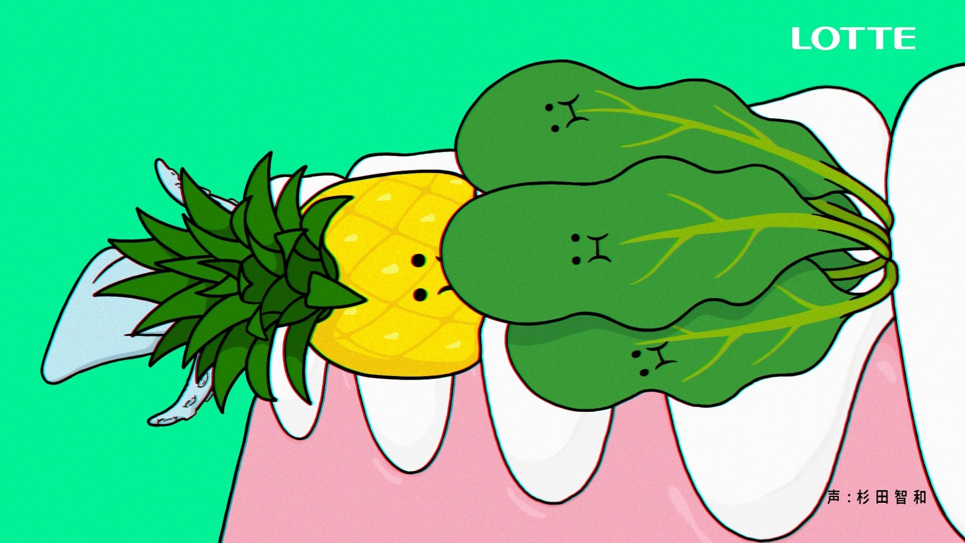 本ムービーの声を、人気声優の杉田智和さんが担当し、3体のメンバーの声をお一人で演じています。いか、パイナップル、ほうれんそうが、それぞれ特徴的な声を発しながら、歯と歯の間から抜け出せない様子をお楽しみください。なお、左右から立体的に聞こえるバイノーラル仕様になっているので、ぜひイヤホンを付けてご視聴ください。