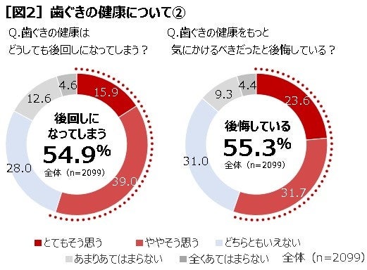 大事だと思ってはいるものの、具体的にどうしていいかわからないのが歯ぐきの健康実態です。そのためか、半数以上が「歯ぐきの健康は(他の健康課題に比べて)どうしても後回しになってしまう」(54.9%)と感じ、「歯ぐきの健康をもっと気にかけるべきだったと後悔している」(55.3%)人も半数を超えています[図2]。