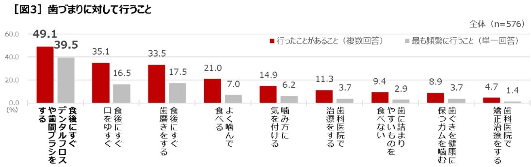 歯ぐきの健康の1つのバロメーターとなる「歯づまり」について、20〜70代以上の男女576人を対象に聞きました。まず、歯づまりに対して行ったことがあることを聞くと、「食後にすぐデンタルフロスや歯間ブラシをする」(49.1%)が最も高く、次いで 「食後にすぐ口をゆすぐ」(35.1%)、「食後にすぐ歯磨きをする」(33.5%)が続いています。その中で最も頻繁に行うことを聞くと、こちらも「食後にすぐデンタルフロスや歯間ブラシをする」(39.5%)がトップでした[図3]。