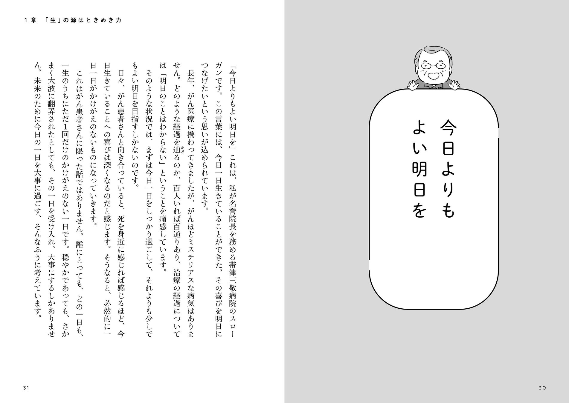 帯津先生が名誉院長を務める帯津三敬病院のスローガン。この言葉には、今日一日を生きることができた、そのよろこびを明日につなげたいという思いが込められています。