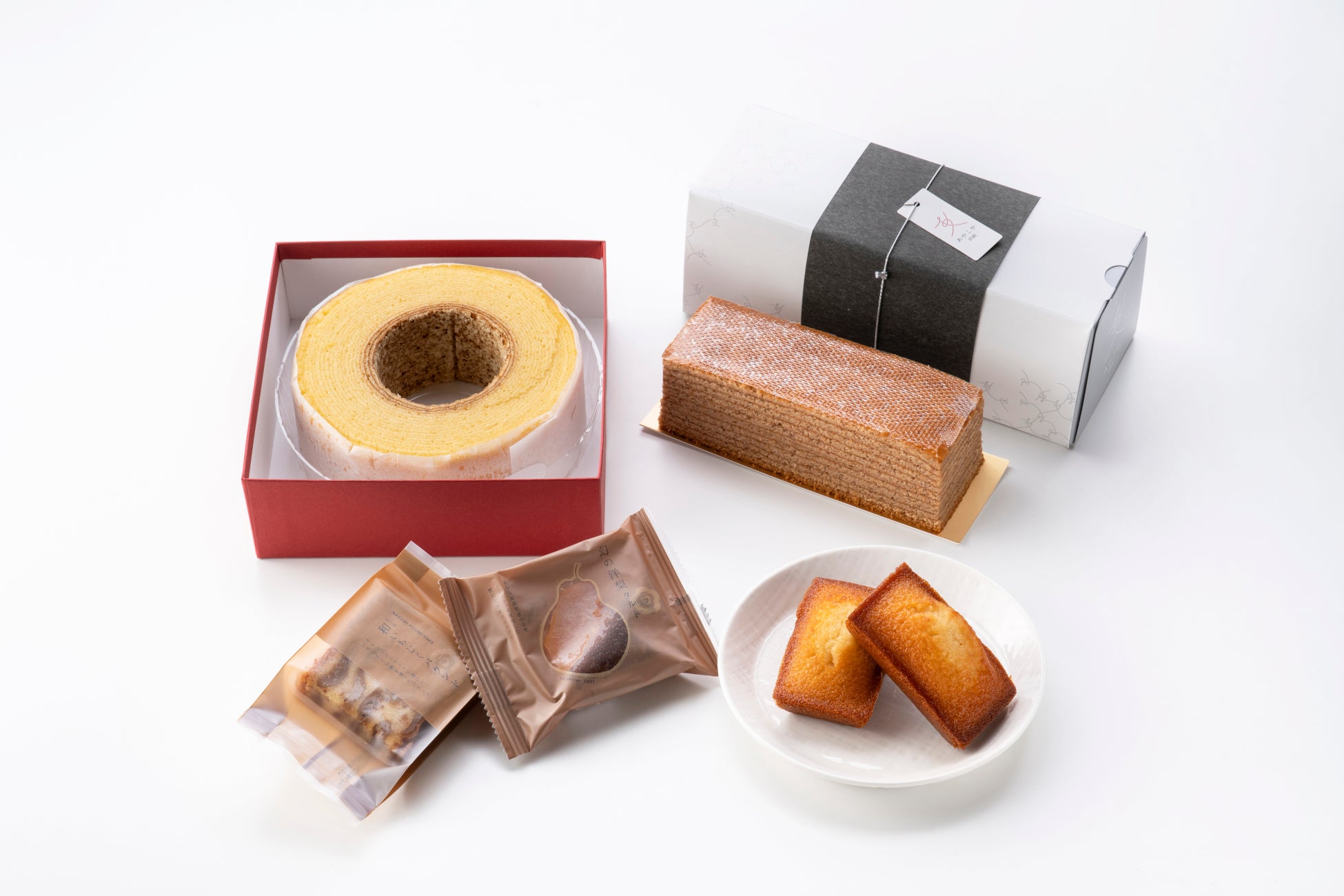 新潟ドッカン祭り➀〈DRESS MITA MASAKI LAB.〉はちみつフィナンシェsp 1個 420円 ➁〈BARREL COFFEE BAUM〉プレミアムバウム凛々1ホール(直径14cm高さ5cm) 2,500円 ➂〈米と餡あやこや〉あやこやバウム栗 1個 1,400円 ➃〈百花園〉和いちじくパウンド 1個 302円、幻の洋梨タルト 1個 324円/1階 ウィークリー・セレクトスイーツ3