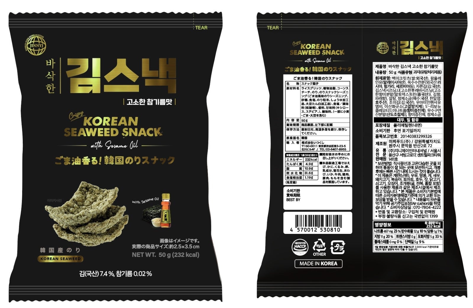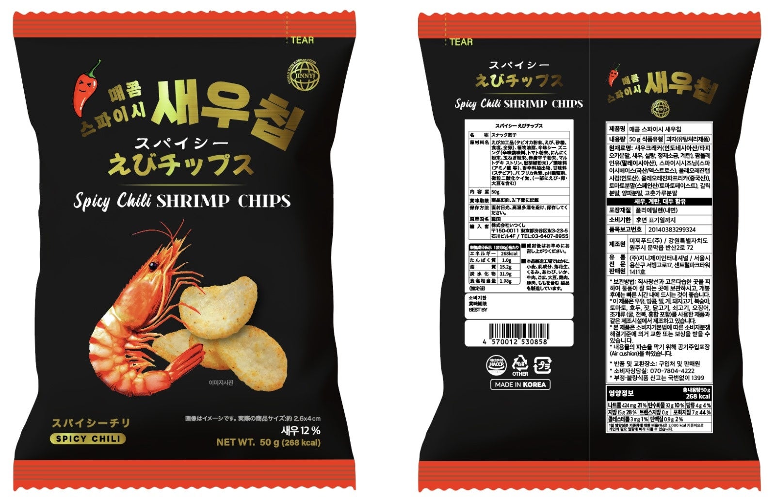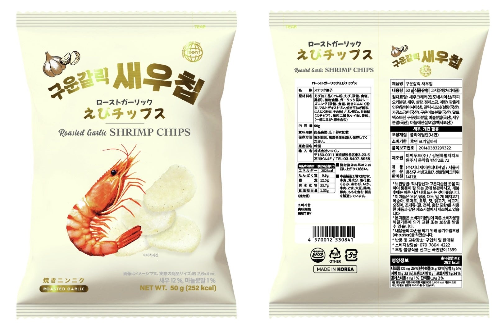 〈JINNYJ〉➀ごま香る!韓国のりスナック(50g) 432円 ➁スパイシーえびチップス(50g) 432円 ➂ローストガーリックえびチップス(50g) 432円/地階イベント(明治屋横)