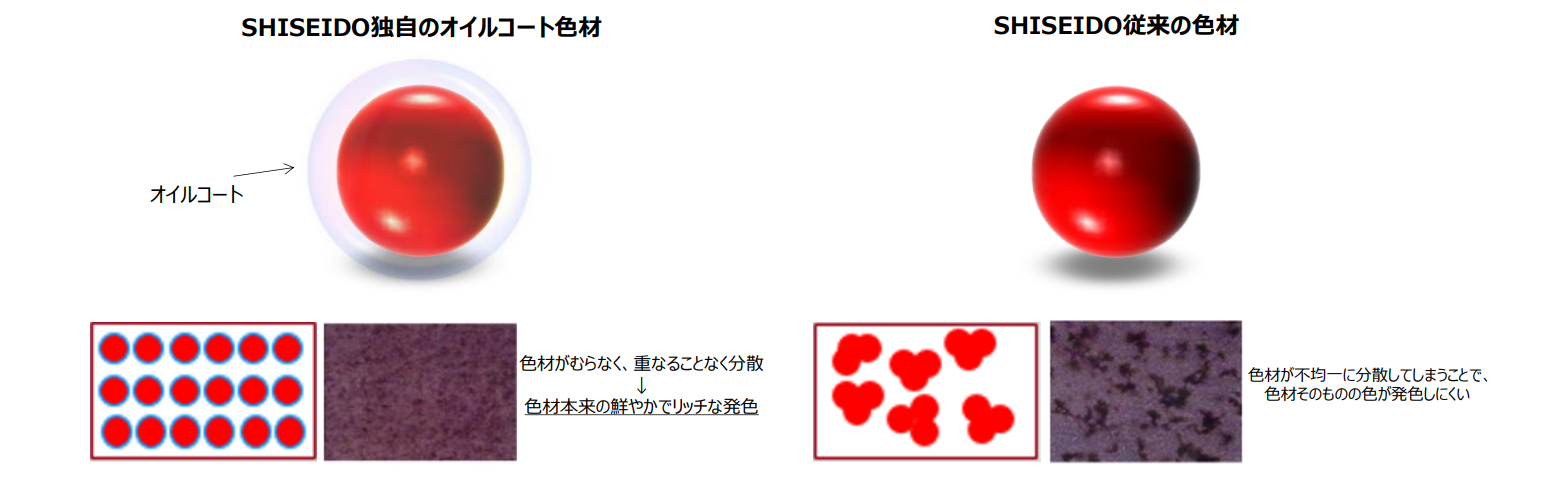 SHISEIDO独自開発のオイルコート色材を採用しました。オイルコートによって色材が分散しやすくなるので、色材本来の色がきれいに発色します。また、汗や水に強く、仕上がりが長持ちします。