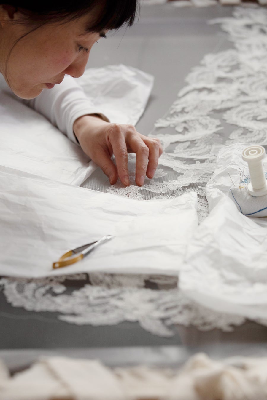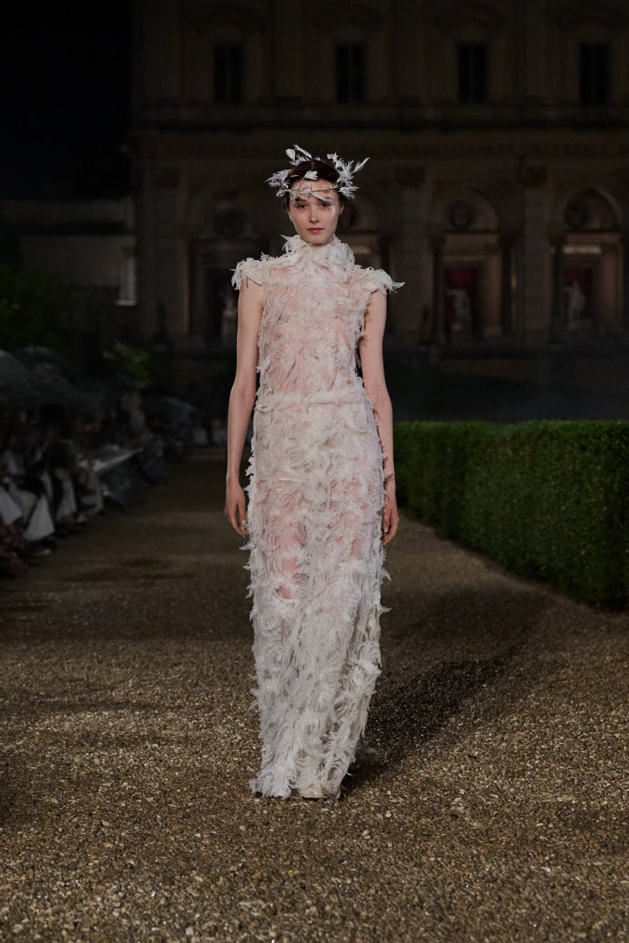 2026年クルーズ コレクションで発表された、純白のレース刺繍が重なるロングドレスの製作風景が公開されました。マリア・グラツィア・キウリが大切にした‟軽やかさ“を、オートクチュールの刺繍職人がレースという素材でその匠の技により再定義しています。まるで小花を一つずつ束ねてブーケを作るように、丁寧にレースを重ねることで、動きのある純白のシルエットが生まれました。この立体的なデザインは、スケッチで描かれた繊細な表現をもとに、伝統的なシャンティレースを使って素材から再解釈したものです。装飾は深みがありポエティックでありながら、一息つくと全体が浮かび上がっていきそうな軽やかな印象を与えます。
