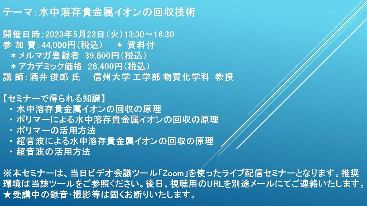 先端技術情報や市場情報を提供している(株)シーエムシー・リサーチ(千代田区神田錦町: https://cmcre.com/ )では、 各種材料・化学品などの市場動向・技術動向のセミナーや書籍発行を行っておりますが、 このたび「水中溶存貴金属イオンの回収技術」と題するセミナーを、 講師に酒井 俊郎 氏 (信州大学 工学部 物質化学科 教授)をお迎えし、2023年5月23日(火)13:30より、 ZOOMを利用したライブ配信で開催いたします。 受講料は、 一般:44,000円(税込)、 弊社メルマガ会員:39,600円(税込)、 アカデミック価格は26,400円(税込)となっております(資料付)。