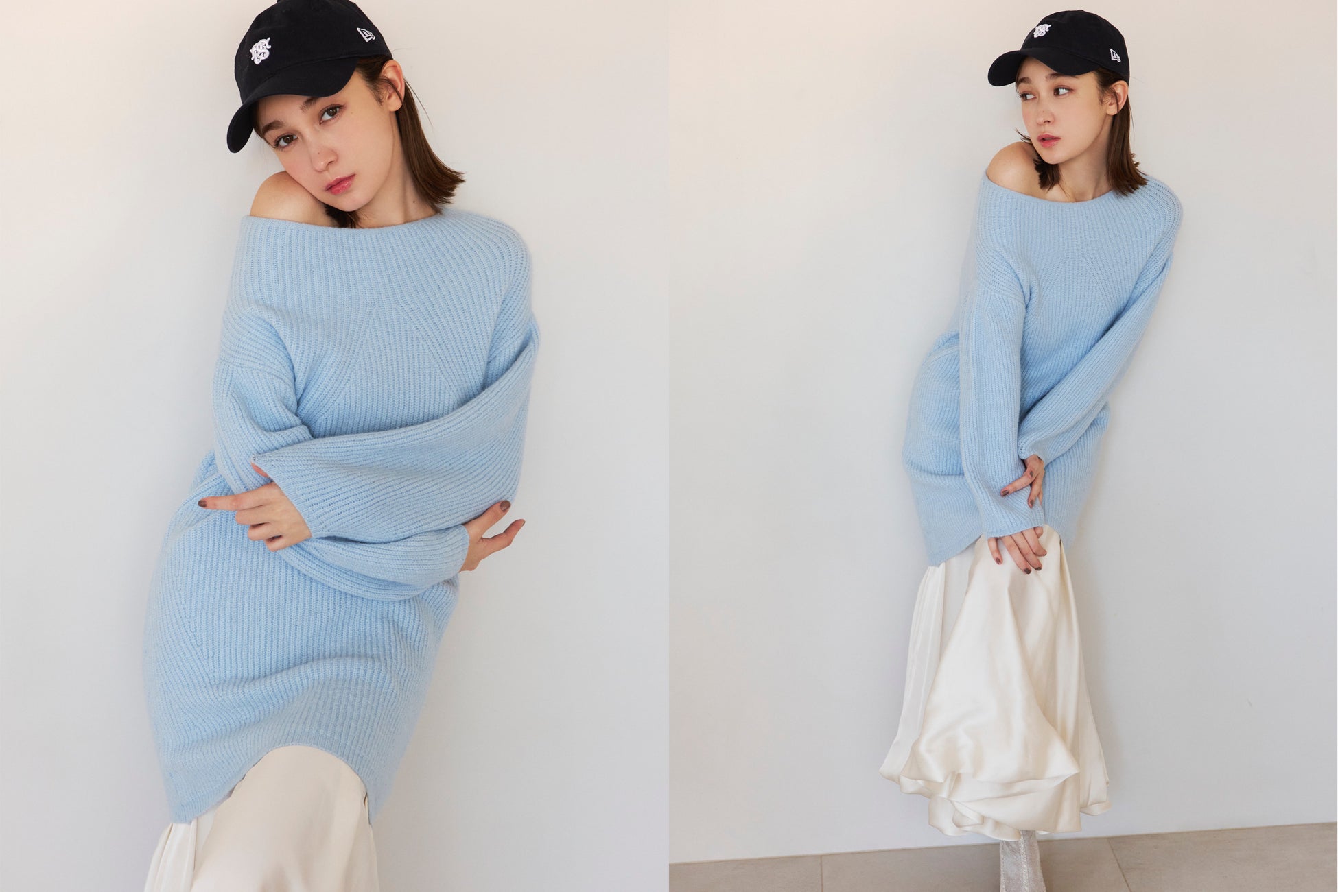 生地にボリュームがあるので、素肌がのぞく広めのネックラインですっきり着こなせるバランスに整えました。