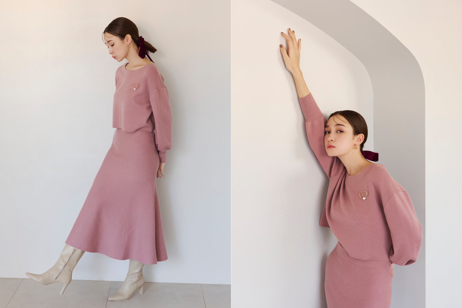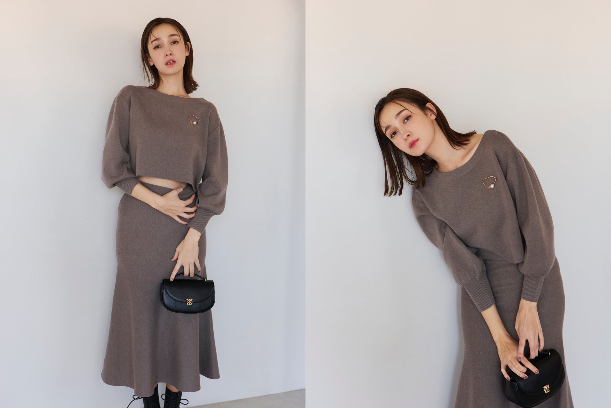 ブローチ付プルオーバーとマーメイドスカートのセットアップ。