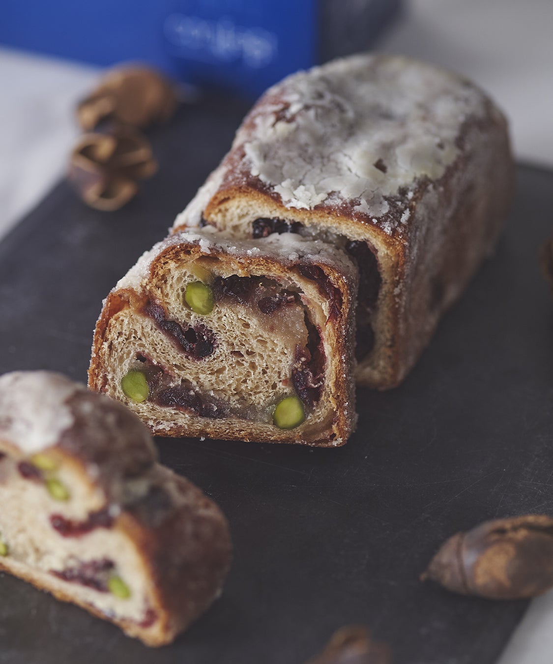 クリスマスカラーをイメージして、赤ワインで煮たクランベリー、ローストしたピスタチオをふんだんに混ぜ込み、マールドシャンパンをあわせたマジパンを渦上に巻き込んだふわっとしっとりしたシュトーレン。生地にはシナモン、カルダモン、アニス、クローブ、を使用。赤ワインで煮込んだクランベリーはシャキッとした食感と程よい酸味。軽く食べやすいさっくり生地に対し、全体に巻き込んだマール酒風味のマジパンがしっとり感を与え、ピスタチオが全体に香ばしいコクを与えます。