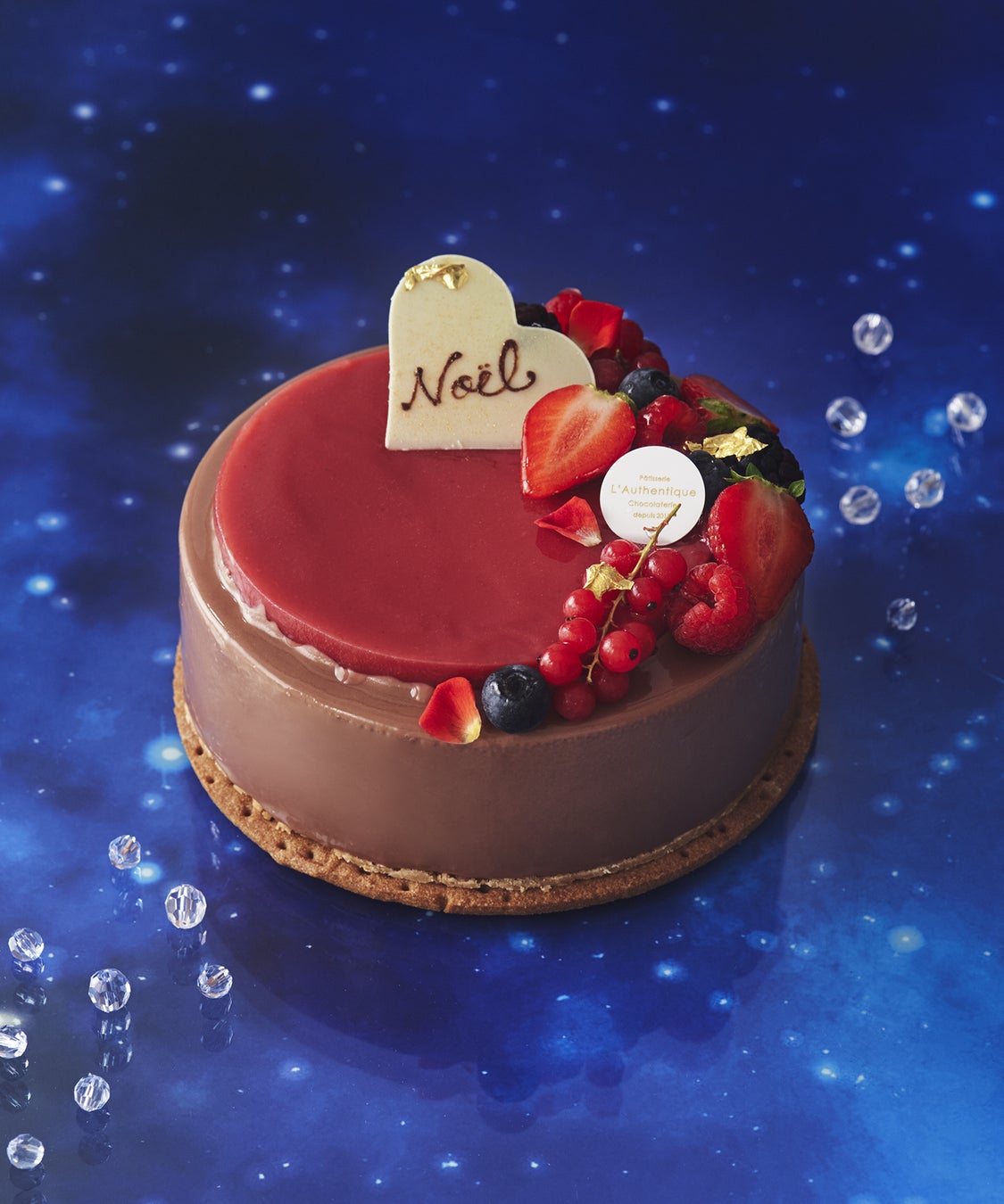 テーマにしたのは星座をモチーフに描かれているというペルーの地上絵。満点の星空を見上げているような壮大なスケールをイメージしています。ペルーにちなんでスポンジにはアマゾンカカオを使い、カカオニブの砂糖がけをトップに散りばめて、星の煌きを表現しました。サクっとした食感のキャラメリゼしたビスキュイに加え、カカオニブの砂糖がけや周囲のフィヤティーヌショコラがアクセントになっています。クリスマスの「Noël」の語源は、誕生という意味のラテン語「natalis」です