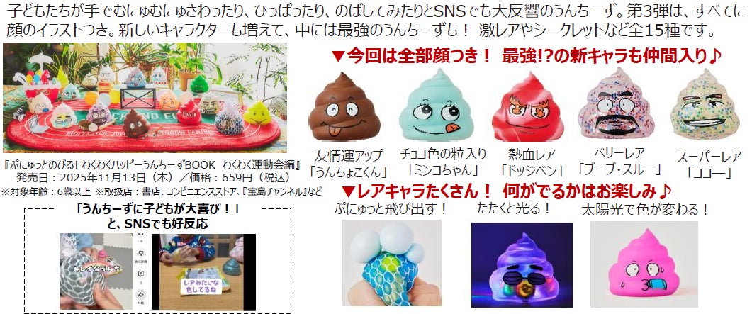 ファッション雑誌販売部数トップシェア(※)の株式会社宝島社(本社:東京都千代田区、代表取締役社長:関川誠)は、自社玩具ブランド「宝島社トイズ」の新商品『ぷにゅっとのびる! わくわくハッピーうんちーずBOOK わくわく運動会編』を2025年11月13日(木)に発売し、 11月26日(水)には『あつめてバトル!恐竜フィギュア&パズルBOOK』を発売します。