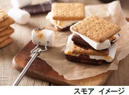 森のCafe(※1)テラス席エリアにおいて、期間限定で用意したハート型のチョコレートと焼きマシュマロをビスケットで挟むスイーツ“スモア”作りが体験できます。