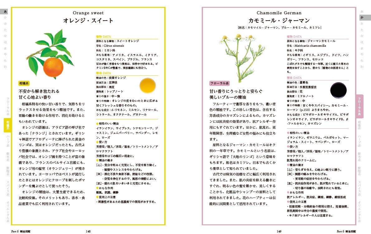 精油117種、植物油&バター33種の図鑑を掲載。原料となる植物と精油の情報が詳しくわかる