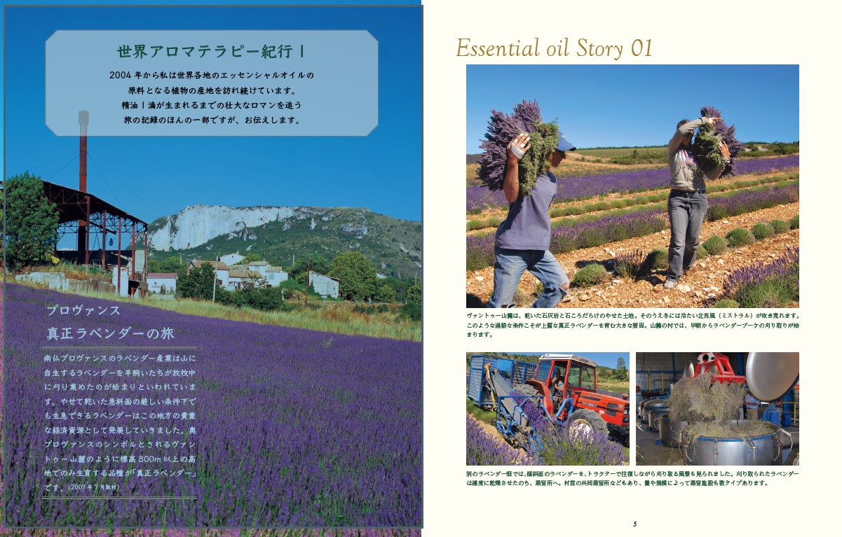 著者である佐々木薫さんがライフワークとしている、世界のアロマテラピーのふるさとをめぐる旅のレポートも掲載。真正ラベンダーのプロヴァンス、ダマスクローズのブルガリア、ネロリのイタリア、ティートリーのオーストラリアなど、貴重な美しい写真と現地取材でしか得られない情報とともに紹介します。