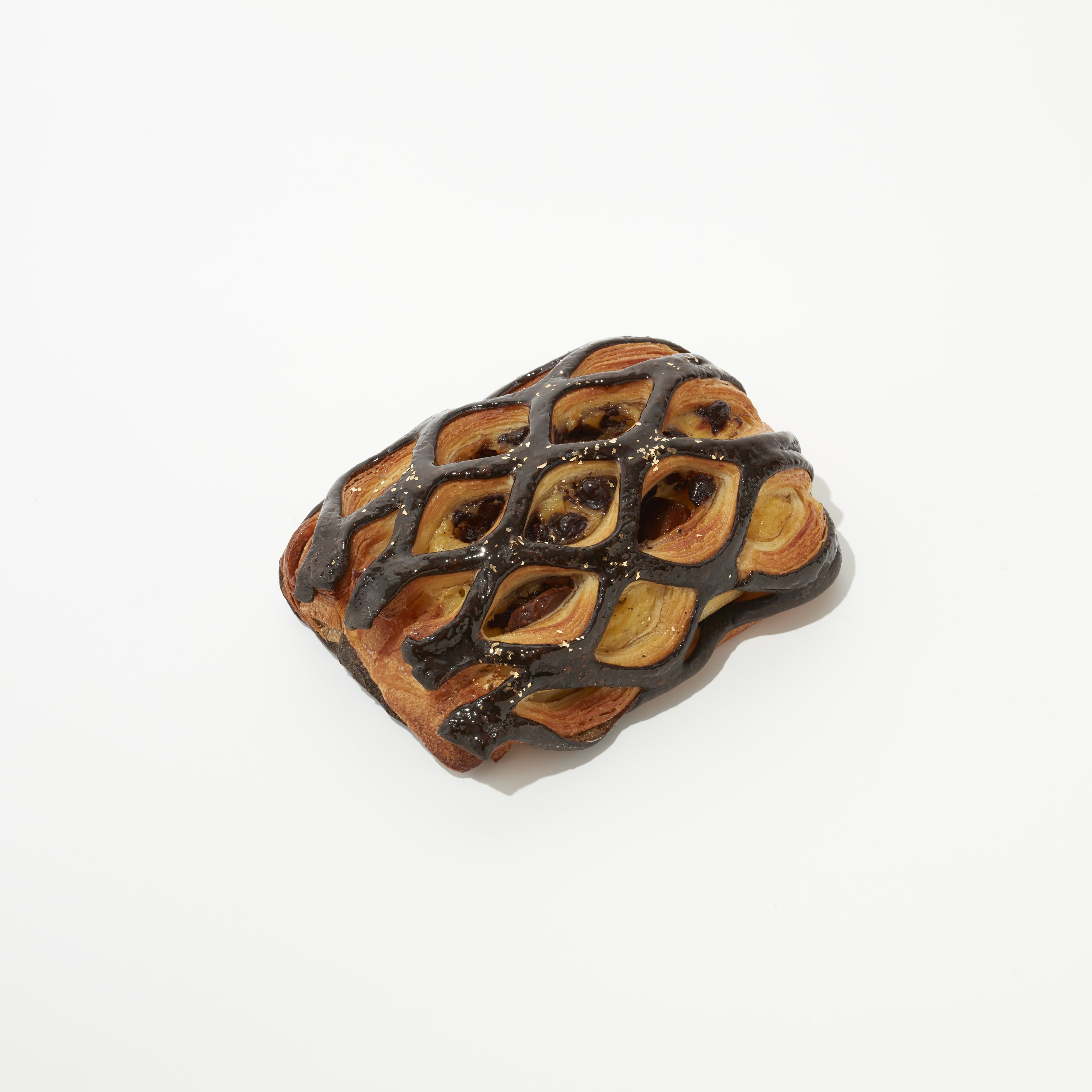 2色のマーブル状の生地に、カスター ド、マカダミアナッツ、チョコチップ を網目状に包み焼き上げました。