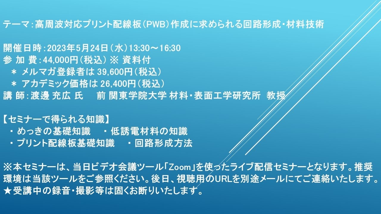 先端技術情報や市場情報を提供している(株)シーエムシー・リサーチ(千代田区神田錦町: https://cmcre.com/ )では、 各種材料・化学品などの市場動向・技術動向のセミナーや書籍発行を行っておりますが、 このたび「高周波対応プリント配線板(PWB)作成に求められる回路形成・材料技術」と題するセミナーを、 講師に渡邊 充広 氏 (前 関東学院大学 材料・表面工学研究所 教授)をお迎えし、2023年5月24日(水)13:30より、 ZOOMを利用したライブ配信で開催いたします。 受講料は、 一般:44,000円(税込)、 弊社メルマガ会員:39,600円(税込)、 アカデミック価格は26,400円(税込)となっております(資料付)。