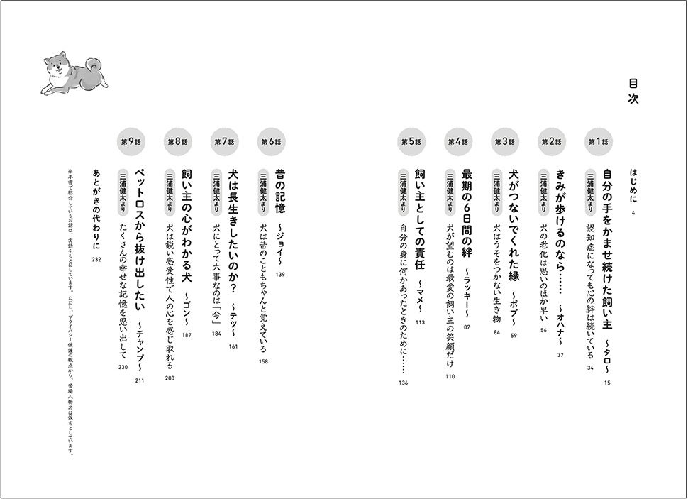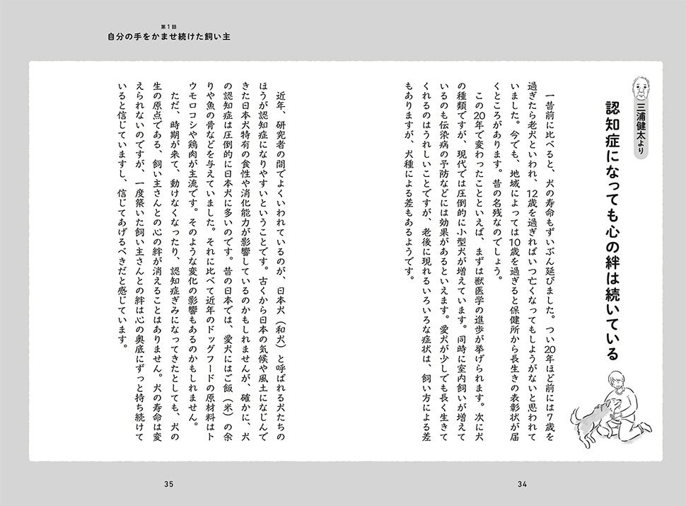 本書では、老いゆく犬にどんなことが起こるのか、その時飼い主はどんな対応をしてきたのか、犬との別れ、そして犬と飼い主の絆とは?などをテーマに、実話をもとにした物語を紹介しています。すべてのお話は、著者の三浦さんが実際に出会った犬と飼い主のエピソードをもとに執筆しています。これから犬を迎える人も、今まさに老犬を飼っている人も、犬を亡くした悲しみの最中にいる人も、すべての飼い主に寄り添う内容となっています。