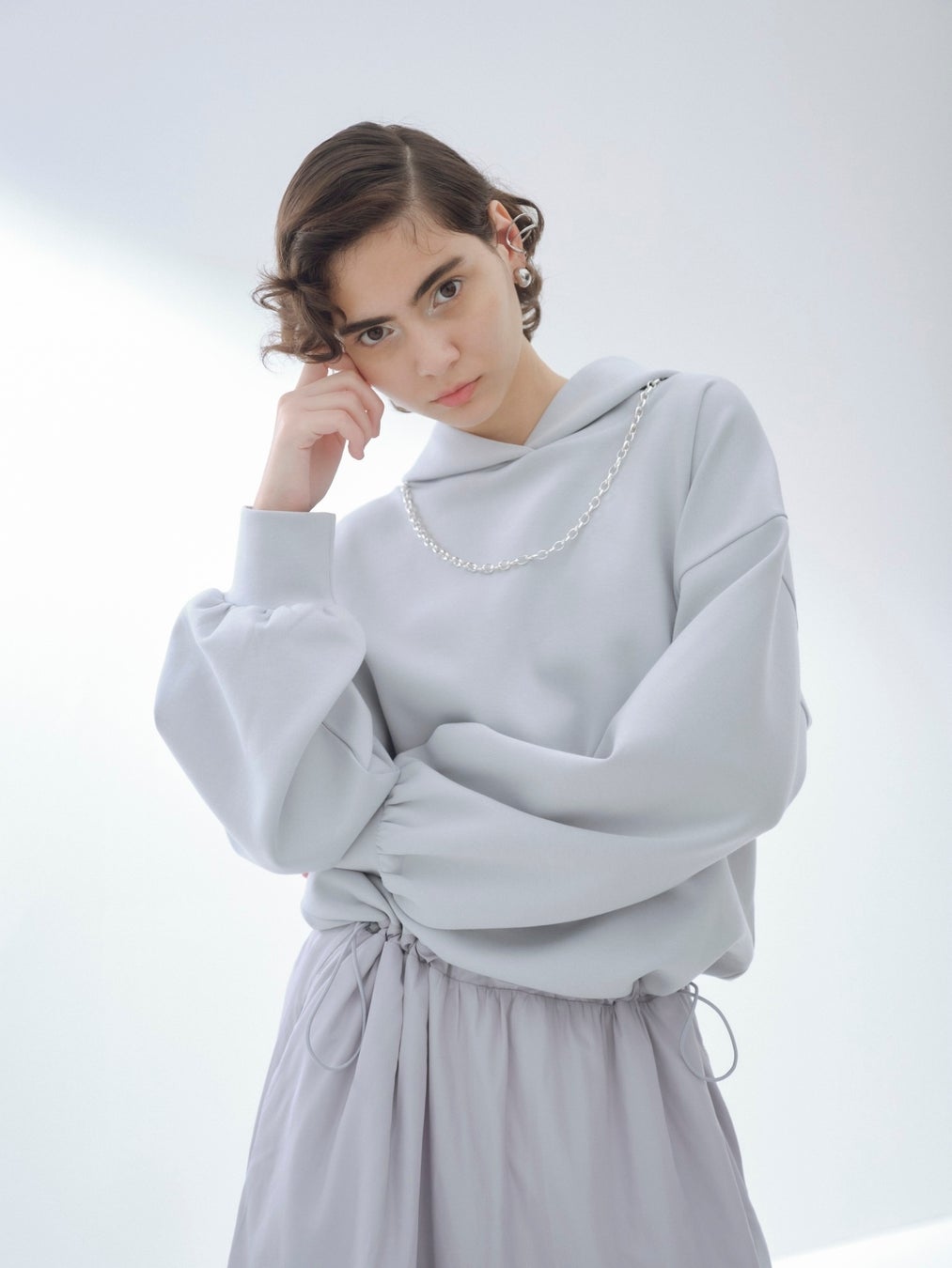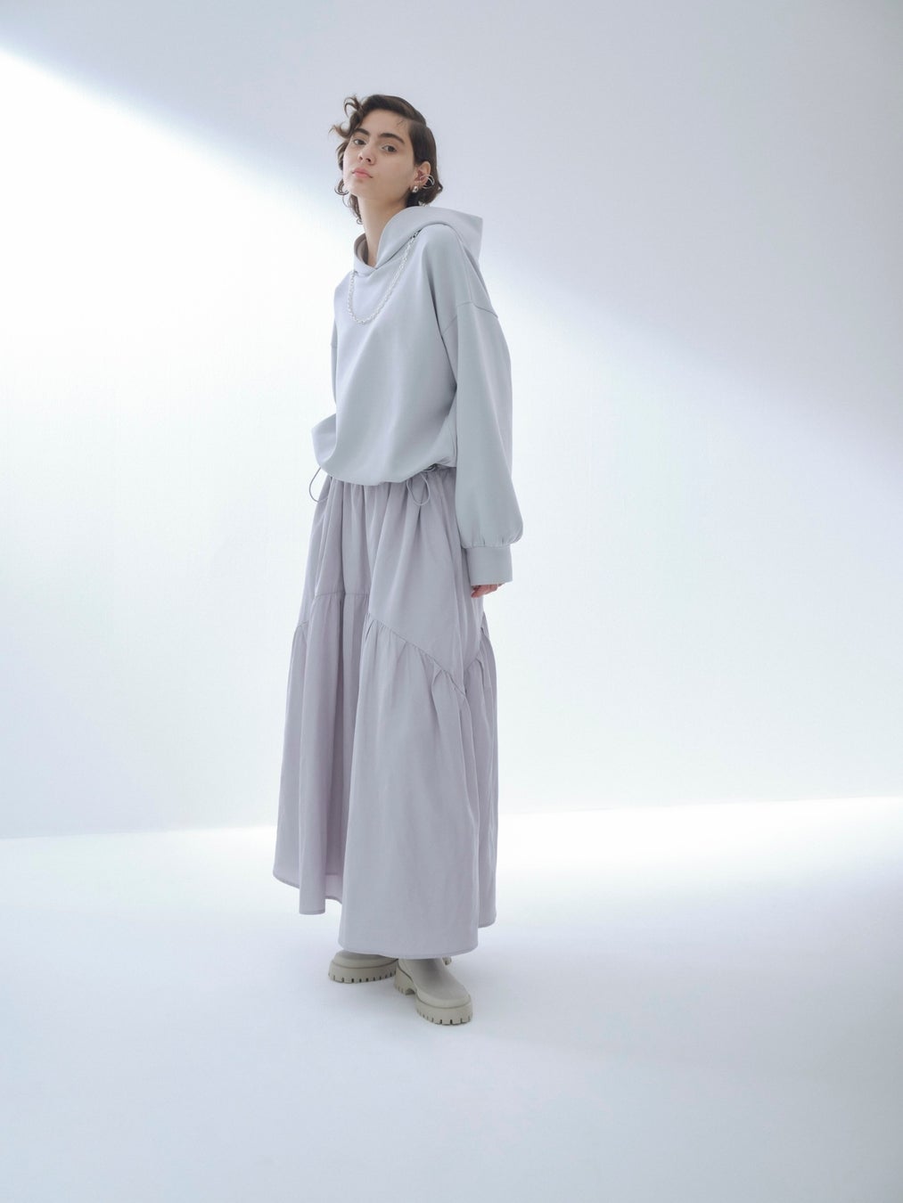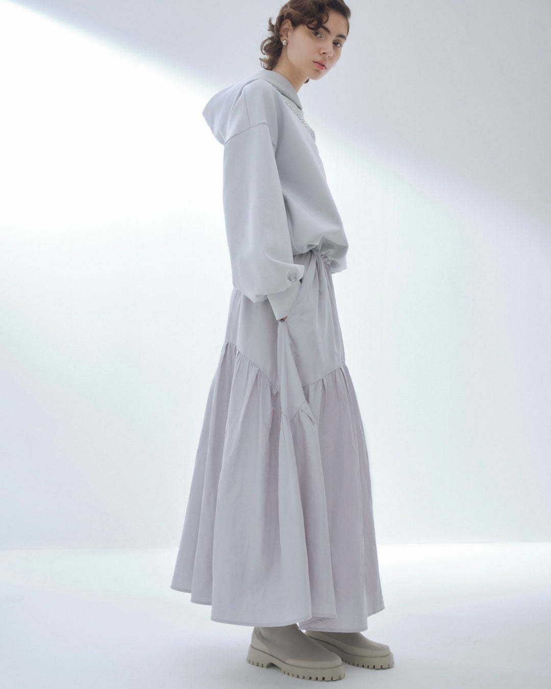 emmiの代名詞とも言えるフーディーワンピースに異素材のスカートをドッキング。