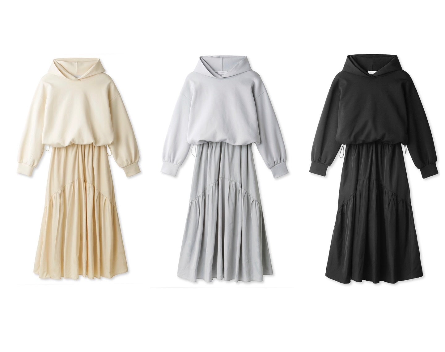 軽やかな着用感で人気のフーディワンピースと、フォーマルにもマルチに使えるジレセットワンピースの2型をラインアップ