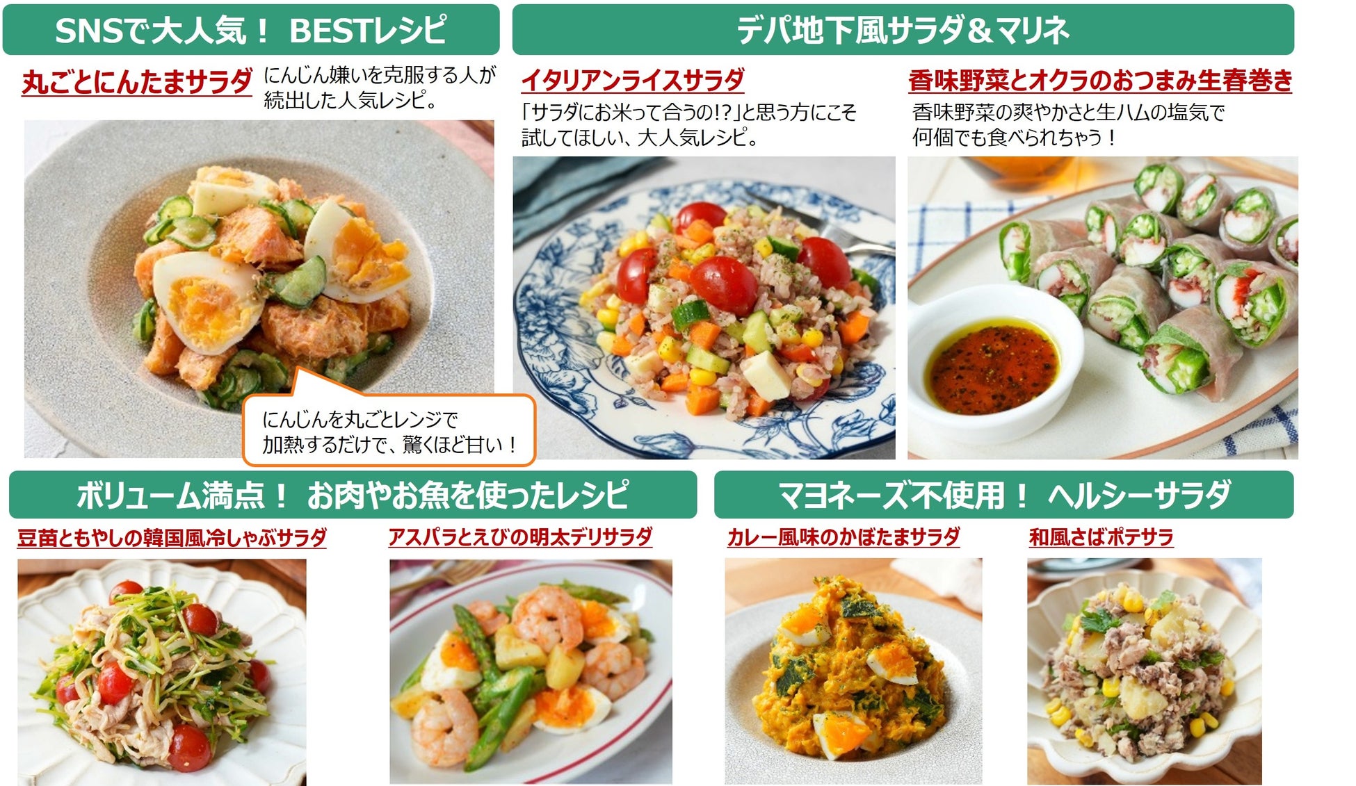にんじん1本を丸ごとレンチンしてゆで卵と和える「丸ごとにんたまサラダ」や、デパ地下風で華やかな見た目の「イタリアンライスサラダ」など、SNSで大きな反響のあった人気レシピも多数収録。日々の献立にもう一品添えたいときや、彩り豊かな一皿で毎日の食卓をぱっと明るくしたいときに重宝する、野菜がごちそうになるレシピを集めた一冊です。