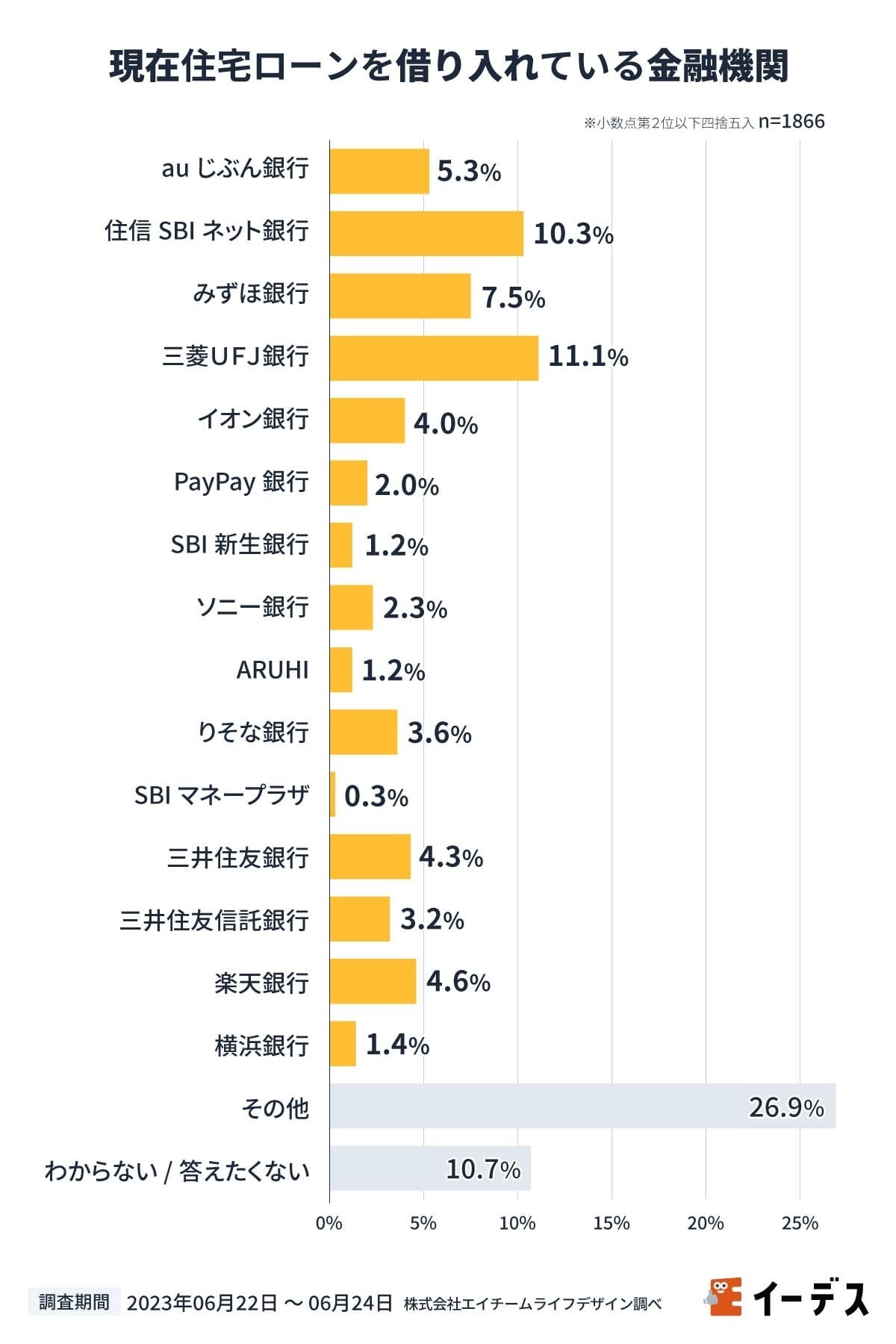 住宅ローンを借り入れている金融機関は、三菱UFJ銀行が最多で11.1%、次いで住信SBIネット銀行が10.3%、みずほ銀行、auじぶん銀行などが5.0%~8.0%前後