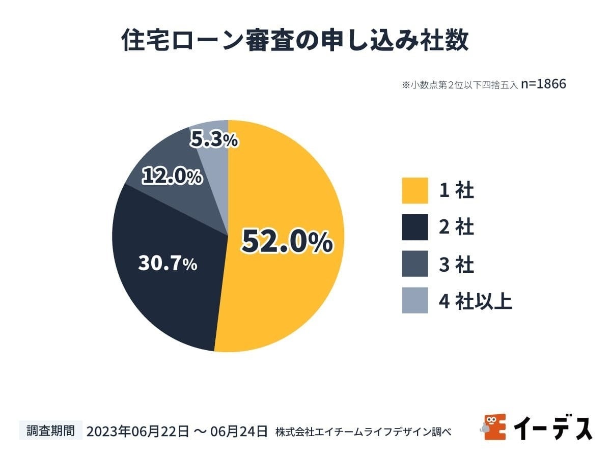 住宅ローン審査の申込み社数について質問したところ、住宅ローン審査を1社のみで申し込んだ割合は(52.0%)と、2社以上で審査を申し込んだ割合(48.0%)はほぼ1:1の結果になりました。