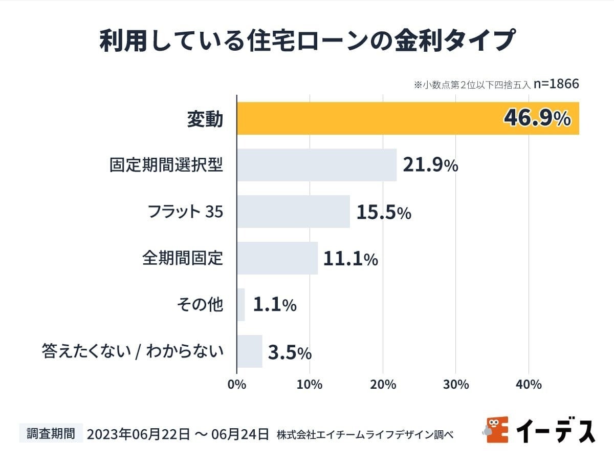 利用している住宅ローンの金利タイプは、変動金利が最多で46.9%、次いで固定期間選択型が21.9%、フラット35が15.5%、全期間固定金利が11.1%
