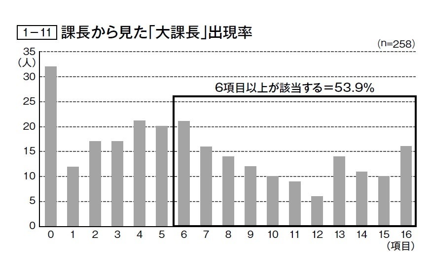 一人の管理職が何項目に該当しているかという観点で、16項目で3分の1を超える6項目以上に該当する管理職を「大課長」と考えてみた場合、「大課長」の出現率は53・9%に上りました。自分の上司が16個すべてに該当すると答えた人すら6・2%もいました。本アンケート調査の結果では、課長から見た「大課長」出現率は実に2人に1人と、非常にゆゆしき事態が明らかになりました。