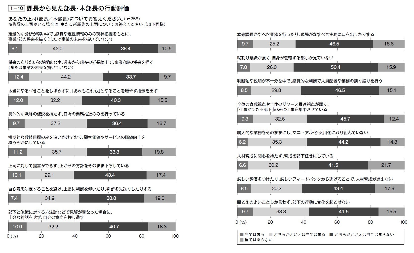 「課長からみた部長・本部長の行動評価」の設問では、16の項目で、当てはまる/どちらかといえば当てはまる/どちらかといえば当てはまらない/当てはまらないのいずれかを選んでもらいました。結果、当てはまる/どちらかといえば当てはまると回答した人が最も多かった項目は「将来のありたい姿が曖昧な中、過去から現在の延長線上で、事業/部の将来を描く(または事業の未来を描いていない)」で合計56.6%になりました。