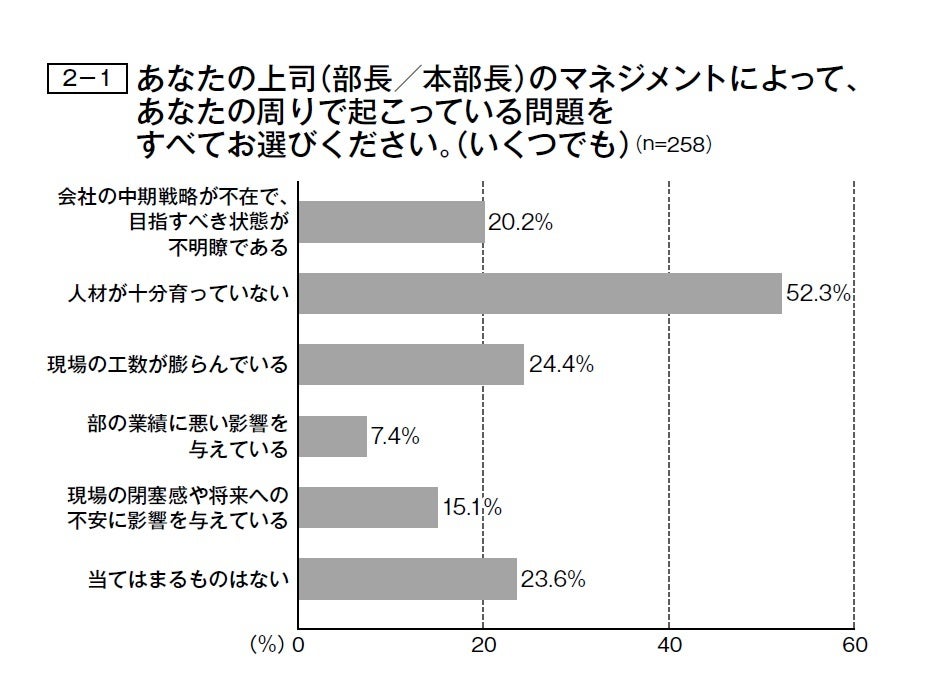 課長に「上司(部長/本部長)のマネジメントによって周りで起こっている問題」について聞いた設問では、「人材が十分に育っていない」が最も高く52.3%でした。