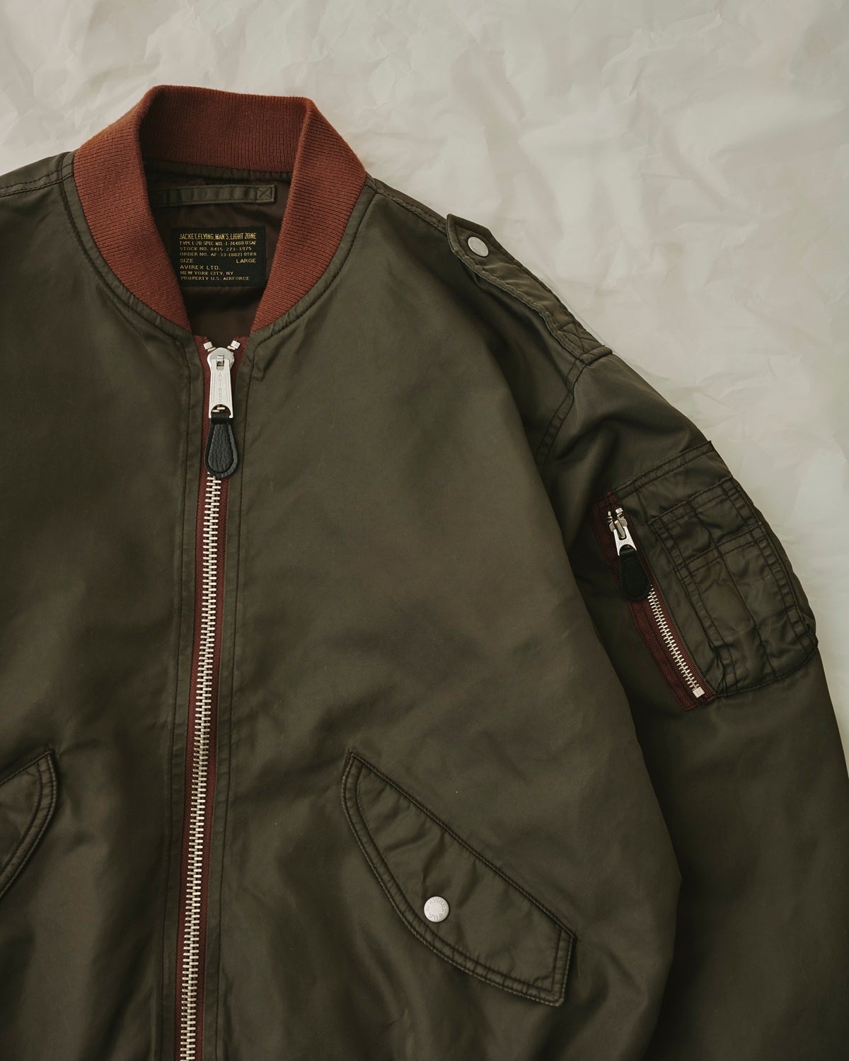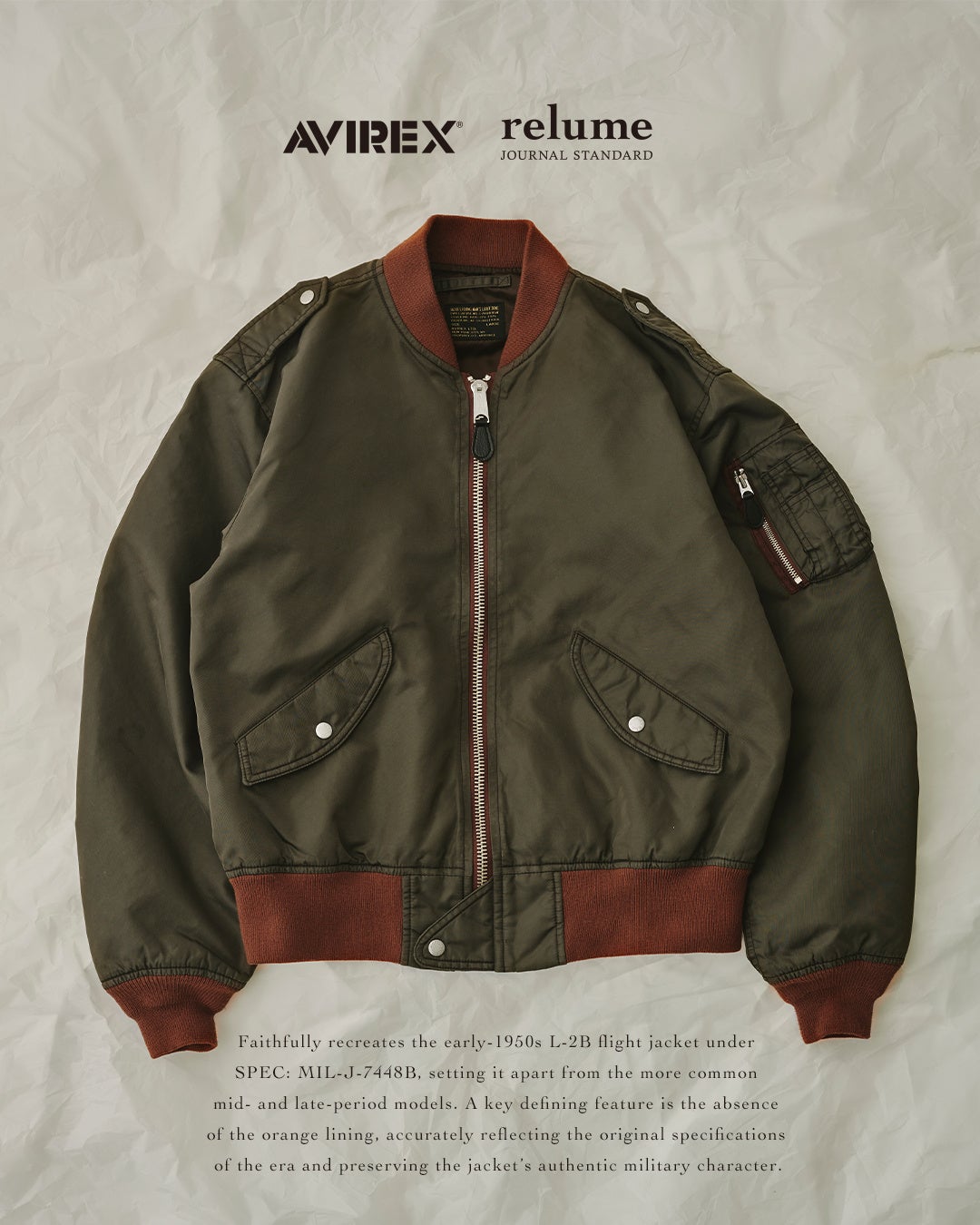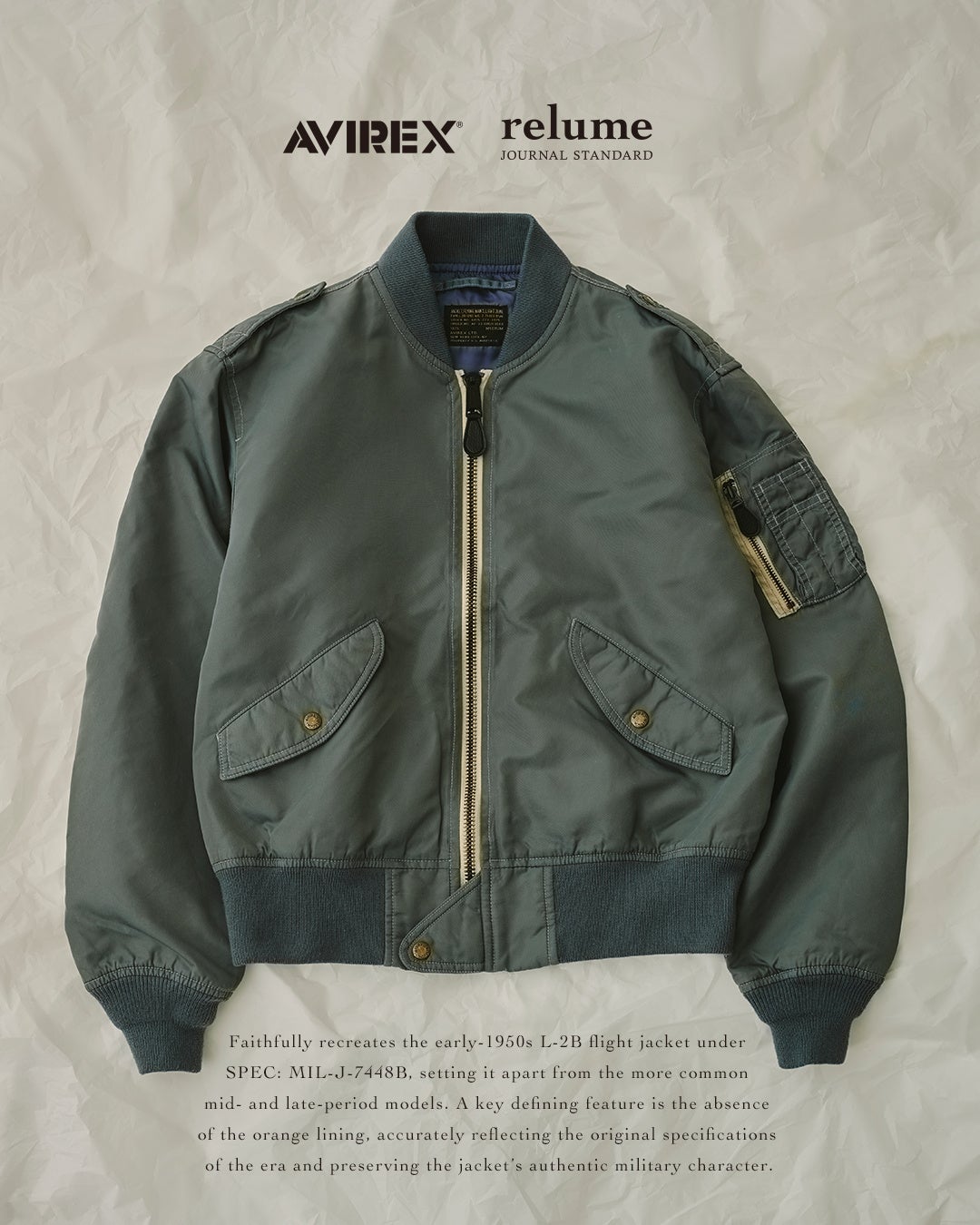 初期型L-2Bの希少なディテール、現代的なアップデート、そしてAVIREXならではのタフネスが融合した、relume渾身の別注モデルです。