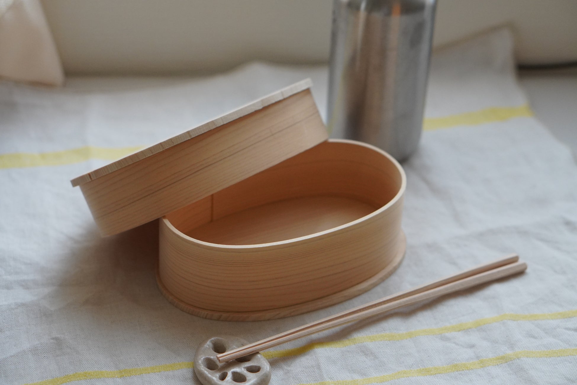 木が呼吸をすることで湿度を調整してくれるので、冷めてもご飯が美味しく食べれる曲げわっぱ。一つ一つ手づくりで、木の目の出方が異なるため自分だけのお気に入りを見つけていただけます。