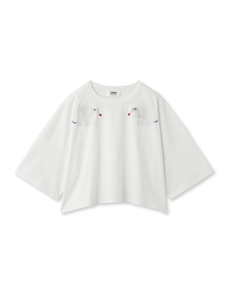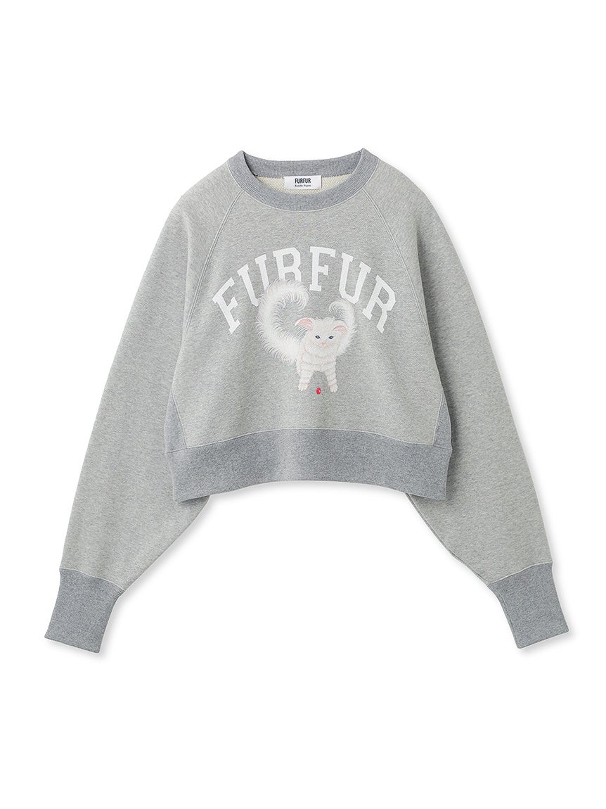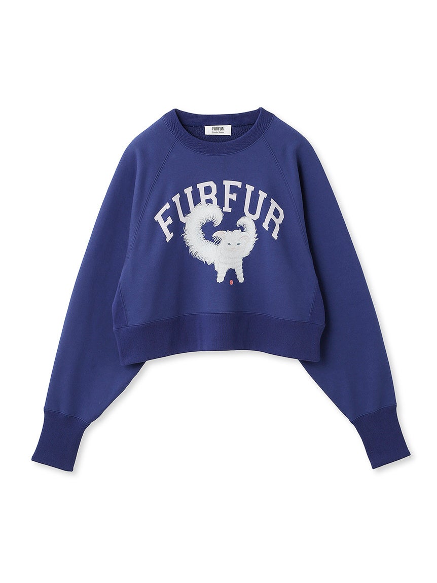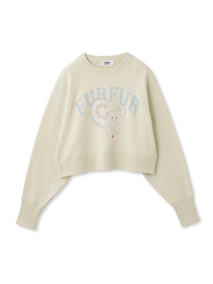 FURFURのカレッジロゴをあしらったショート丈スウェットにプリントしたのは、羽根のような2本の尾で飛ぶことができるものの折れやすく、歩くが苦手な"ミラ"。