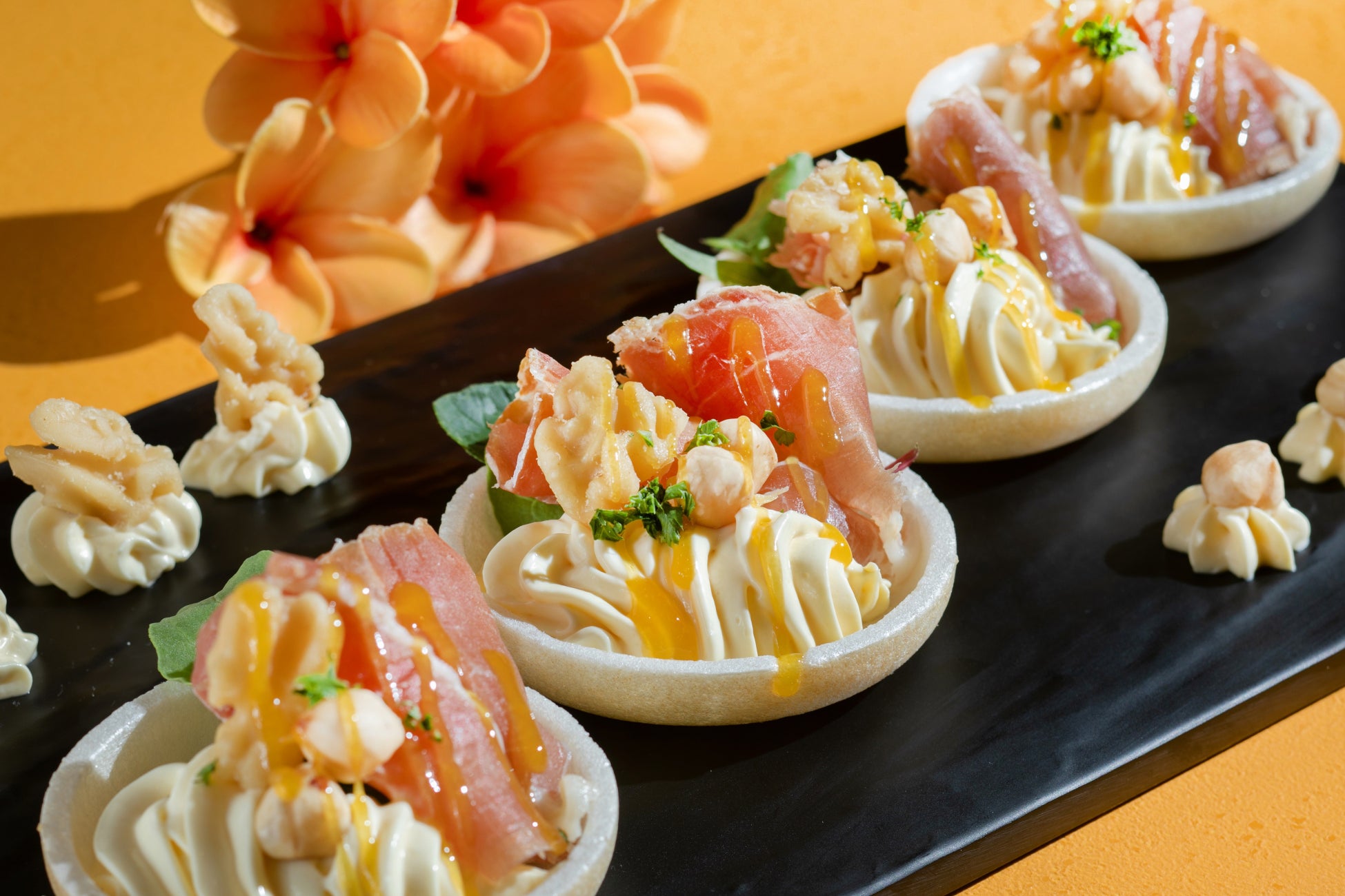 リリコイクリームチーズの最中 ナッツと生ハム添え / チキンロングライス