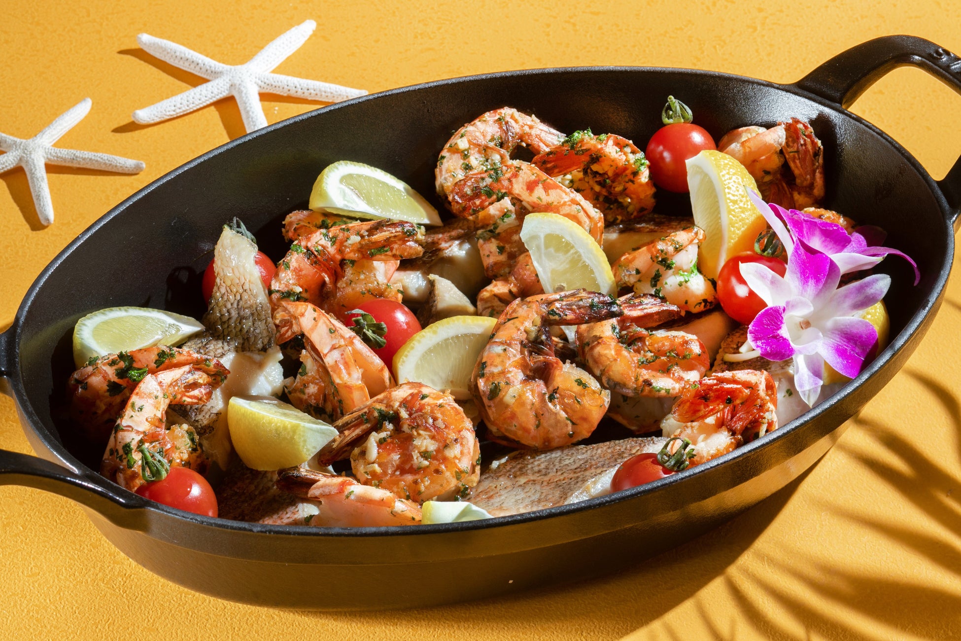 ガーリックシュリンプと白身魚のオーブン焼き リリコイバターソース