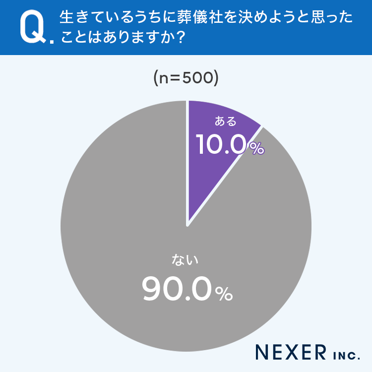 その結果「ある」は10.0%にとどまり、「ない」が90.0%と大半を占めました。葬儀について考えたことがある方でも、葬儀社の選定まで進めているケースは多くないことがわかります。