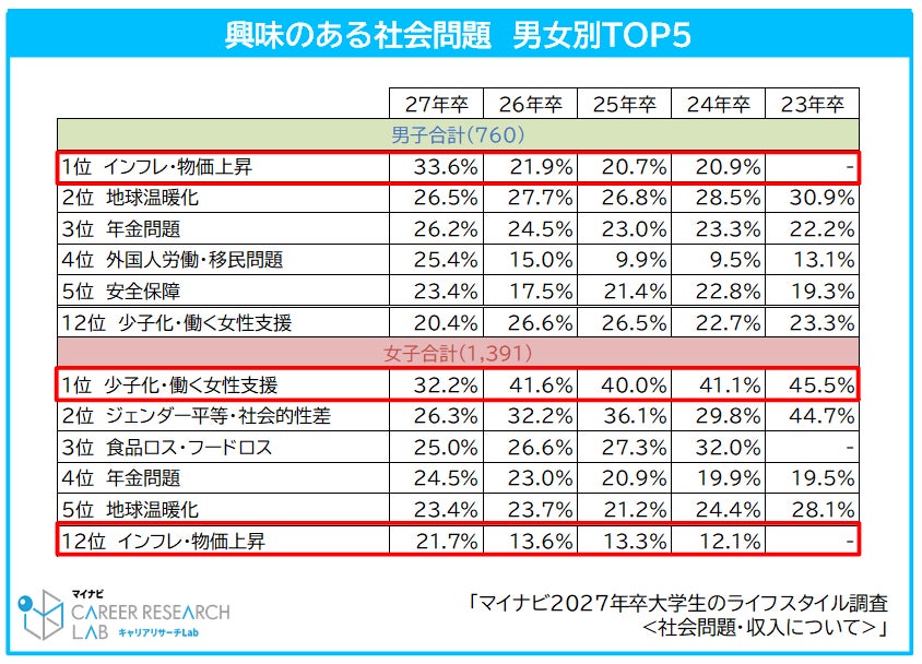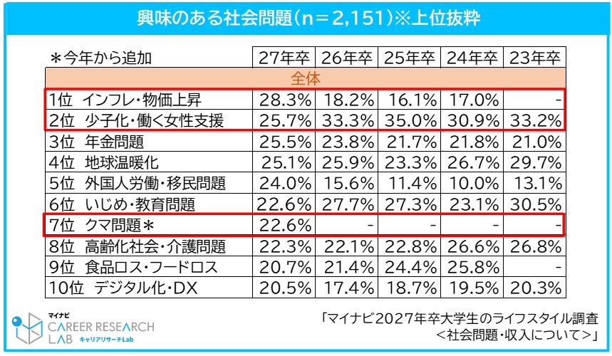 学生が興味のある社会問題1位は「インフレ・物価上昇」で前年比10.1pt。増女子学生の1位は「少子化・働く女性支援」。今年初めて「クマ問題」が7位にランクイン