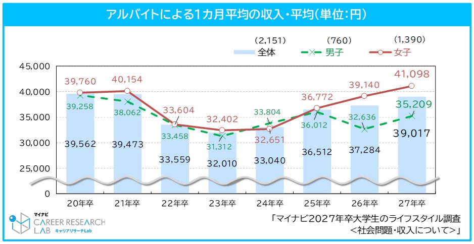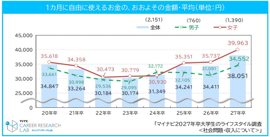 2027年卒の学生のアルバイトによる1カ月平均の収入は、39,017円(前年比1,733円増)で、コロナ禍前の21年卒の水準(39,473円)まで回復した。また、男子は35,209円(前年比2,573円増)、女子は41,098円(前年比1,958円増)で女子のほうが高く、女子の値は調査開始以来最高額だった。また、アルバイト代や親からの仕送りなどの収入のうち、1カ月に自由に使える金額を聞いたところ、全体の平均は38,051円(前年比3,640円増)で、調査開始以来最高額だった。【図4】