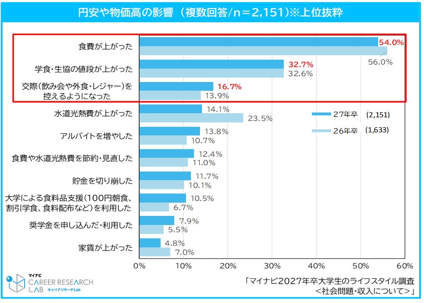 円高や物価高の影響について聞いたところ、「食費が上がった(54.0%、前年比2.0pt減)」が最多で、次いで「学食・生協の値段が上がった(32.7%、前年比0.1pt増)」、「交際(飲み会や外食・レジャー)を控えるようになった(16.7%、前年比2.8pt増)」だった。