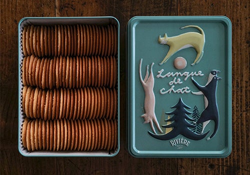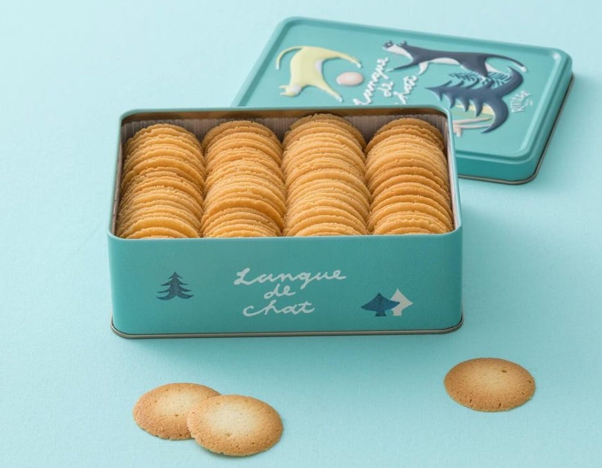 可愛らしい猫の缶にぎっしり入っているのは、ごく薄く焼き上げた繊細なクッキー。