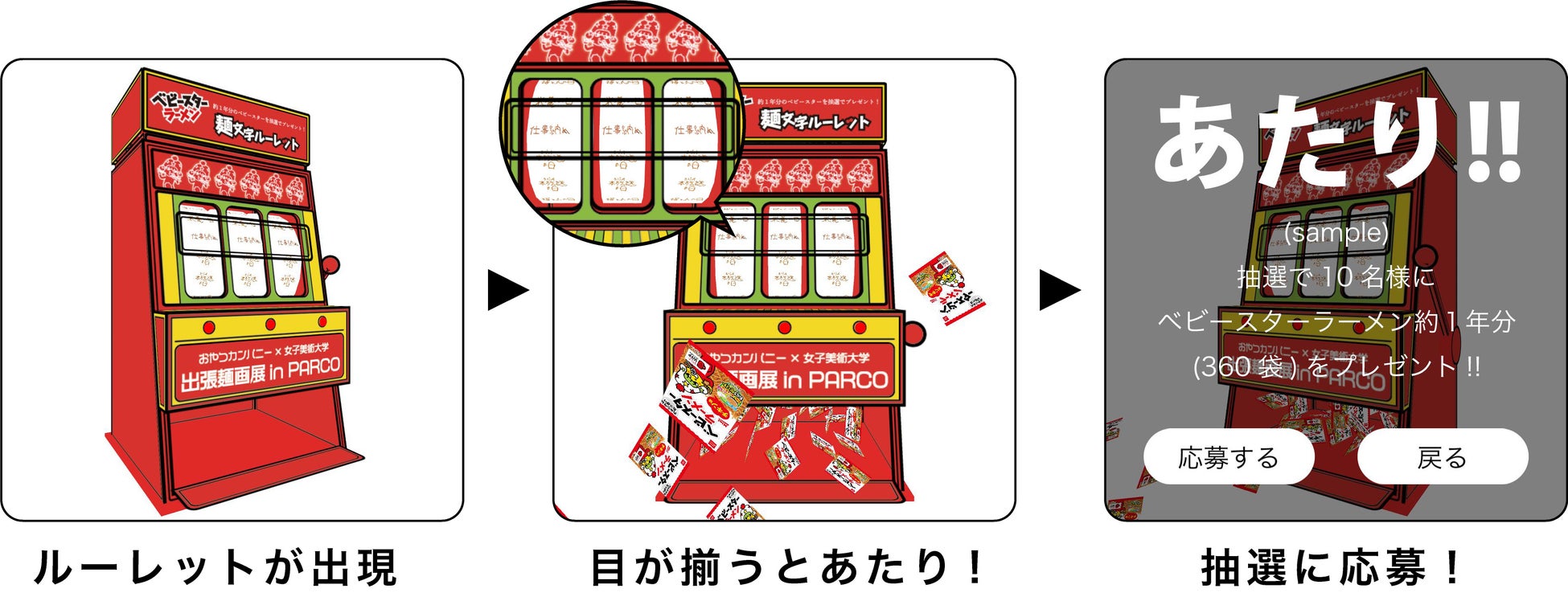 対象店舗に設置された専用の二次元バーコードをお手持ちのスマートフォン・タブレットで読み込むとAR技術を使用した「ベビースター麺文字ルーレット」(参加費無料)をお楽しみいただくことができます!更に600円(税込)以上お食事をいただき、ルーレットで「あたり」が出ると、抽選で10名様に約1年分(360食)のベビースター ラーメン(チキン味)をプレゼント!