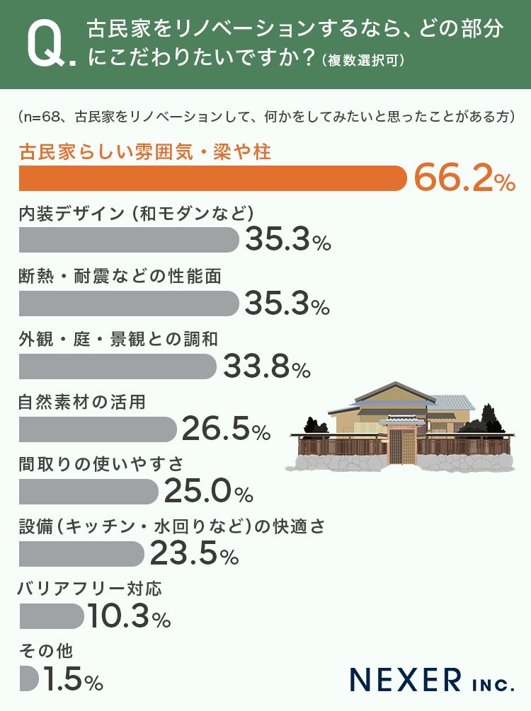 ■66.2%が、こだわりたい部分として「古民家らしい雰囲気・梁や柱」と回答