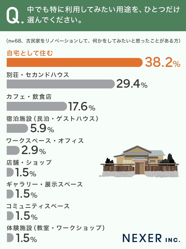 複数回答の結果と順位は同じですが、ひとつに絞ると「自宅として住む」と「別荘・セカンドハウス」で約3人に2人を占めました。古民家リノベーションというと、まずは住まいとしての活用を思い浮かべる方が多いようです。